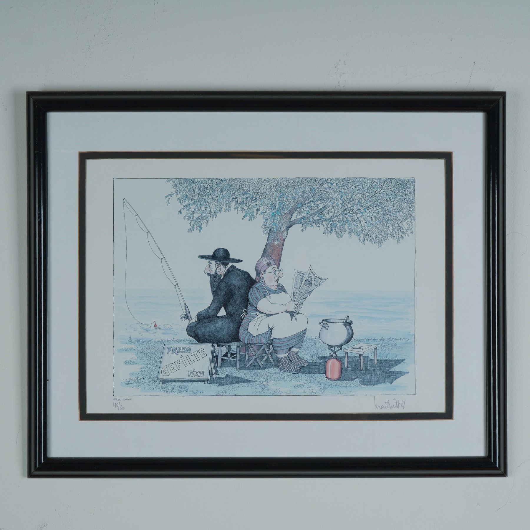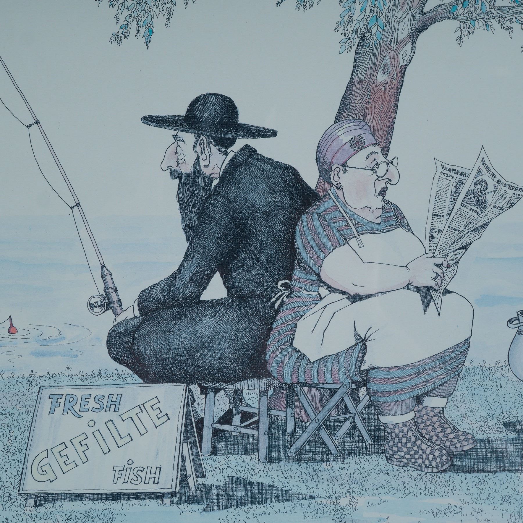 Delightfully humorous limited edition color litograph by the celebrated British cartoonist Martin Holt. This special edition is a rare gem, brimming with wit, cultural charm, and illustrative finesse. Executed in Holt's instantly recognizable whimsical style, the scene captures a traditionally dressed Orthodox Jewish man fishing placidly under a tree, alongside his equally expressive wife reading a Yiddish newspaper, while a comical sign declares: Fresh Gefilte Fish. The couple sits back to back, embodying Holt's masterful ability to blend character study with gentle satire. Martin Holt was a beloved British cartoonist and illustrator known for his finely drawn caricatures that often celebrated Jewish life and family dynamics. With works that have appeared in publications and galleries worldwide, Holt developed a loyal following for his warm humor and insightful depictions of everyday situations. His artwork is housed in both public and private collections, and his limited edition prints are highly sought after by collectors. Numbered 176/300, and hand-signed by the artist in graphite on lower right.