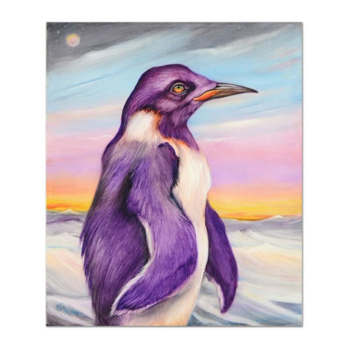 "Purple Penguin" is an original oil painting on stretched canvas by Martin Katon, hand signed by the artist. Includes Certificate of Authenticity. Measures approx. 20" x 24" (image). Reference #: 237526