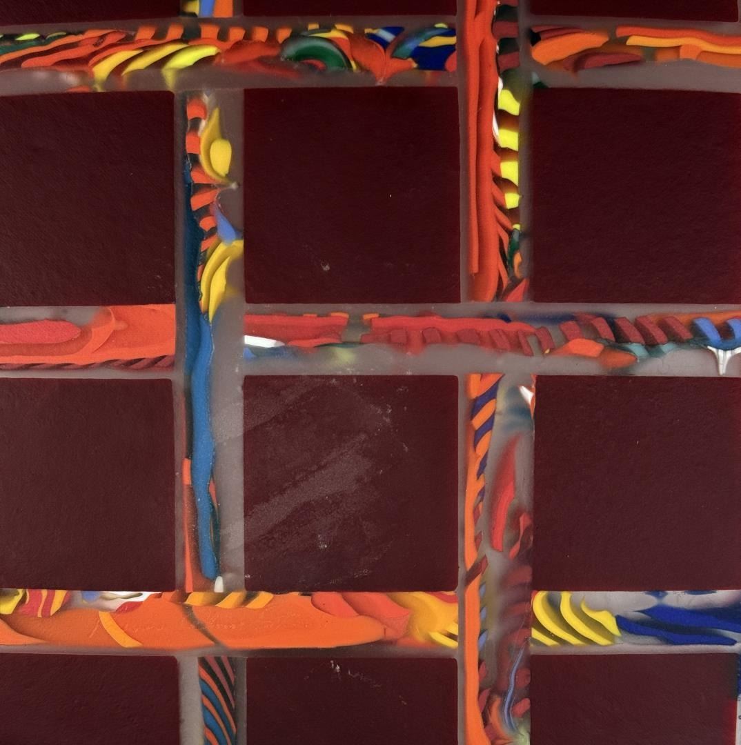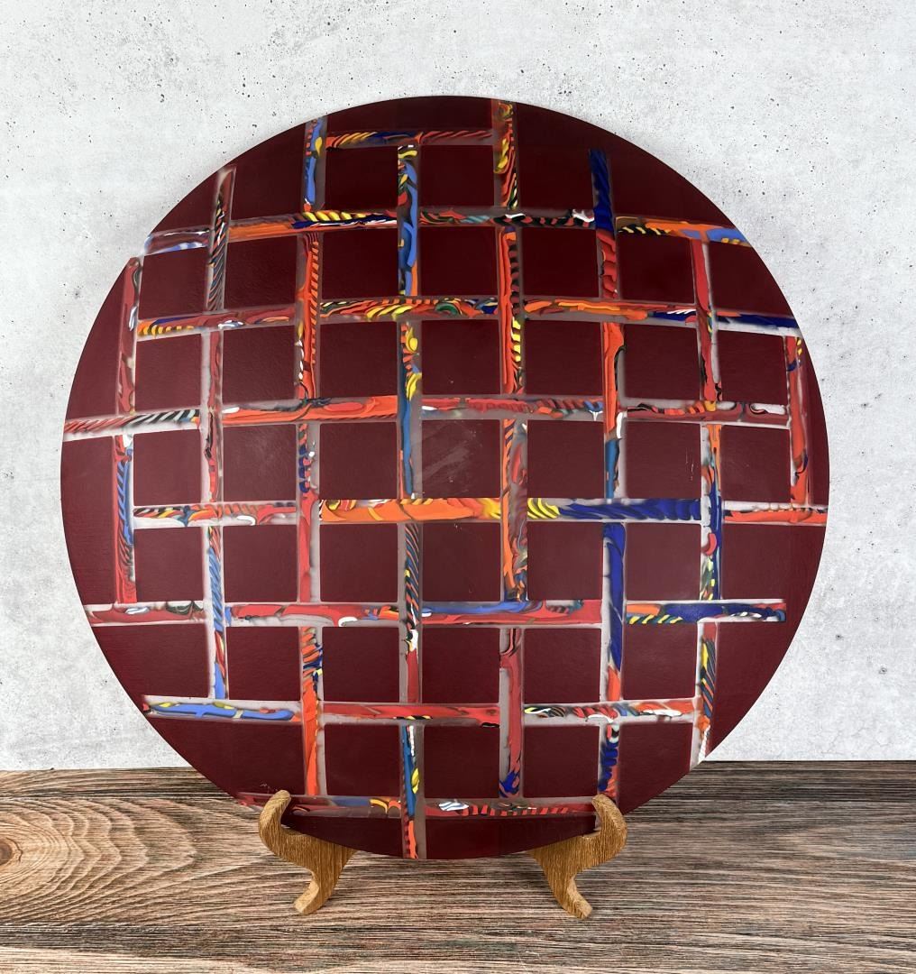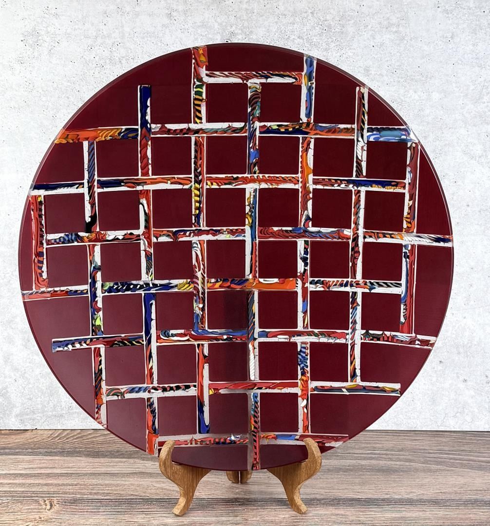 21 1/2" diameter. Artist statement I was a stained glass enthusiast while pursuing a career in medical technology and the glass won, first as a spare-time business and then as a full-time obsession. My first commercial ventures involved combining mineral and seashell specimens with glass, in boxes and hanging pieces. My experience has included glass blowing with several Hudson Valley studios in New York and workshops in blown and fused glass at Penland School in North Carolina, Urbanglass in New York, and the Studio of the Corning Museum of Glass in New York. Over the years my work has included Japanese-style art glass lamps, elegant jewelry boxes and decorative hanging panels. More recently I have concentrated on creating fused glass vessels of stunning form, color, and texture. My newest work involves sculptures of various sizes inspired by sources such as Japanese architecture, sculptor Richard Serra, and glass maestro Lino Tagliapietra. I am influenced primarily by texture and pattern from many sources including Native American fabrics, Italian masonry, classic American quilts, and wood marquetry. Fusing, or kilnforming, is an ancient technique that is undergoing a revival. In fusing, the piece is set up cold, using a variety of techniques in common with traditional stained glass and mosaics. Firing in an electric kiln follows at temperatures up to 1800 °F. As many as four firings may be required to achieve the desired appearance and form. Grinding, sandblasting, and polishing complete the piece. I have taught at the Corning Museum of Glass, Corning, NY; Worcester Arts Center, Worcester, MA; Centre de Verre, Bow NH and Warm Glass Gallery & Studio, Clemmons, NC.