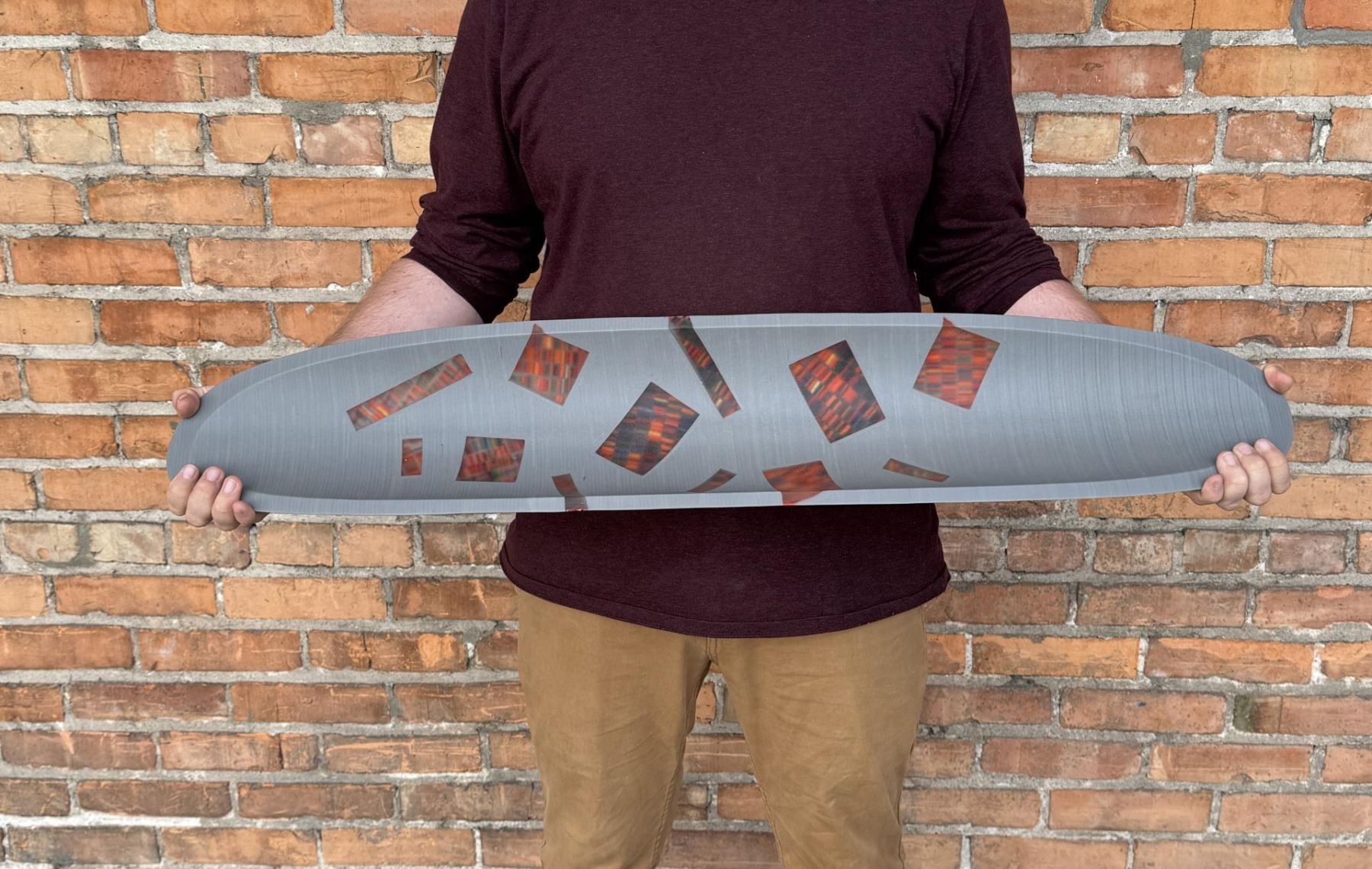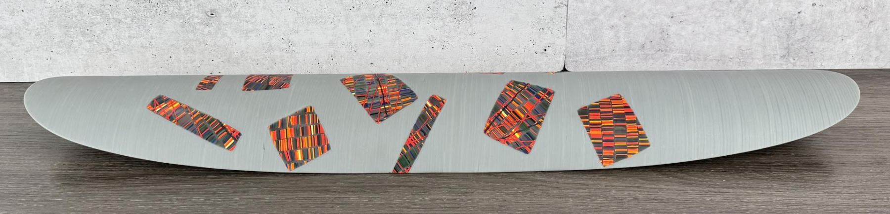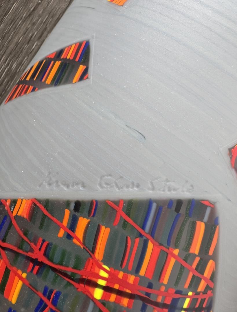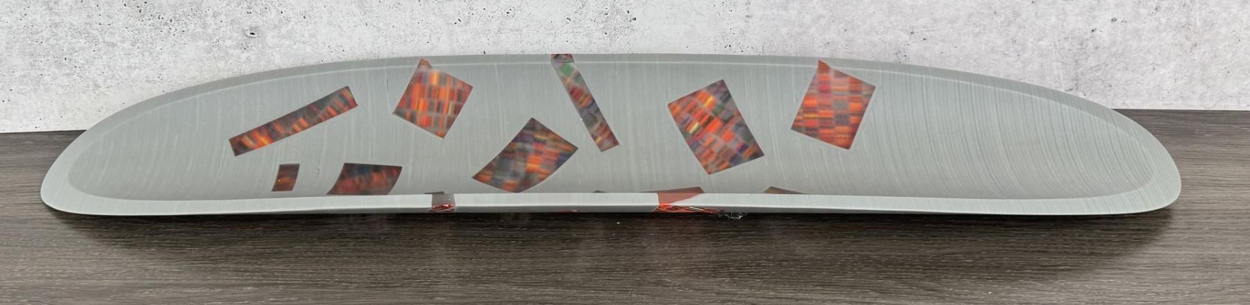 37 1/2" long by 7" wide. Artist statement I was a stained glass enthusiast while pursuing a career in medical technology and the glass won, first as a spare-time business and then as a full-time obsession. My first commercial ventures involved combining mineral and seashell specimens with glass, in boxes and hanging pieces. My experience has included glass blowing with several Hudson Valley studios in New York and workshops in blown and fused glass at Penland School in North Carolina, Urbanglass in New York, and the Studio of the Corning Museum of Glass in New York. Over the years my work has included Japanese-style art glass lamps, elegant jewelry boxes and decorative hanging panels. More recently I have concentrated on creating fused glass vessels of stunning form, color, and texture. My newest work involves sculptures of various sizes inspired by sources such as Japanese architecture, sculptor Richard Serra, and glass maestro Lino Tagliapietra. I am influenced primarily by texture and pattern from many sources including Native American fabrics, Italian masonry, classic American quilts, and wood marquetry. Fusing, or kilnforming, is an ancient technique that is undergoing a revival. In fusing, the piece is set up cold, using a variety of techniques in common with traditional stained glass and mosaics. Firing in an electric kiln follows at temperatures up to 1800 °F. As many as four firings may be required to achieve the desired appearance and form. Grinding, sandblasting, and polishing complete the piece. I have taught at the Corning Museum of Glass, Corning, NY; Worcester Arts Center, Worcester, MA; Centre de Verre, Bow NH and Warm Glass Gallery & Studio, Clemmons, NC.