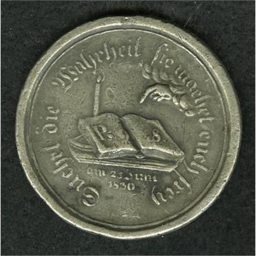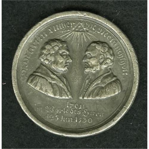 <B>Martin Luther Bible Translation Tercentenary Medal.</B></I> White metal, 52 mm. Obverse: facing busts of Martin Luther and Philip Melancthon, date 25 Jun. 1530 in exergue. Reverse: hand of God points to book of Psalms, date 25 Jun. 1830 below. A worn example with field abrasions and minor reverse corrosion.<BR><BR><b>Shipping:</b> Coins & Currency (<a target="_blank" href="http://www.heritageauctions.com/common/shipping.php">view shipping information</a>)