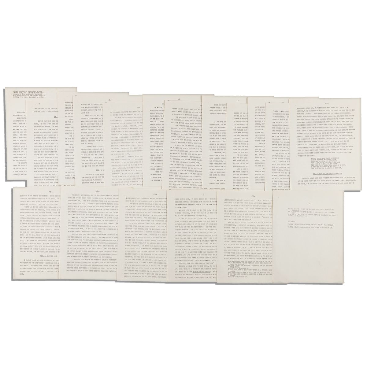 Vintage typed transcript of Martin Luther King, Jr.'s ''Annual Address...On the Fourth Anniversary of the Montgomery Improvement Association'', given at Bethel Baptist Church. Datelined Montgomery, AL, 3 December 1959, document covers MLK's stands on the city's black-only parks, school integration, and the future of desegregation as the organization's president. Runs 18pp. and measures 8.5'' x 11''. Creasing, else near fine. From the collection of Maude Ballou, Martin Luther King Jr.'s close friend and personal secretary.