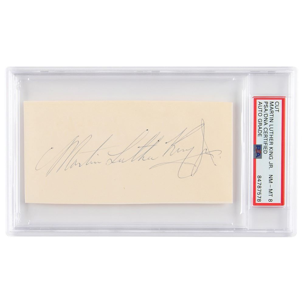 Choice vintage ballpoint signature, "Martin Luther King, Jr.,& rdquo; on an off-white 5 x 2.5 slip. In very fine condition. Encapsulated and graded by PSA/DNA as "NM-MT 8."