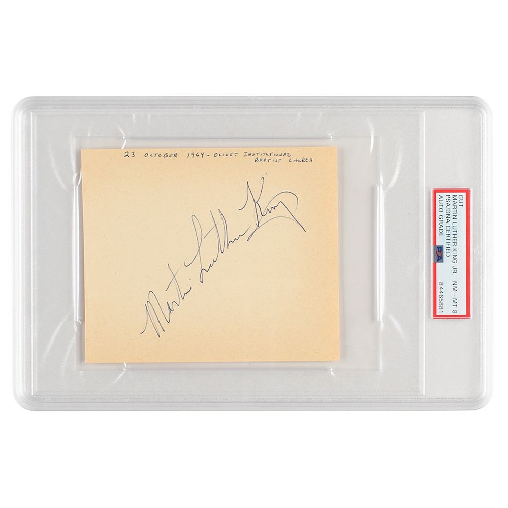 Large and desirable ballpoint signature, "Martin Luther King,†on an off-white 5.25 x 4.5 album page, annotated along the top by the collector: "23 October 1964 - Olivet Institutional Baptist Church." In very fine condition. Encapsulated and graded by PSA/DNA as "NM-MT 8." One week after receiving the Nobel Peace Prize, Martin Luther King, Jr., visited Cleveland on March 23, 1964, for a 'march on the ballot box' to encourage participation in the upcoming elections. He appeared at five street-corner rallies, visited two schools, and spoke at Olivet Institutional Church, one of the largest African American congregations in Cleveland.