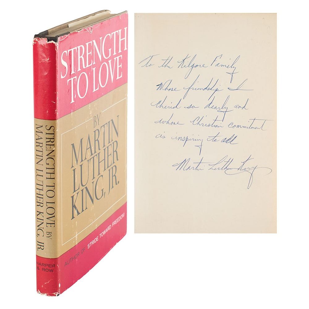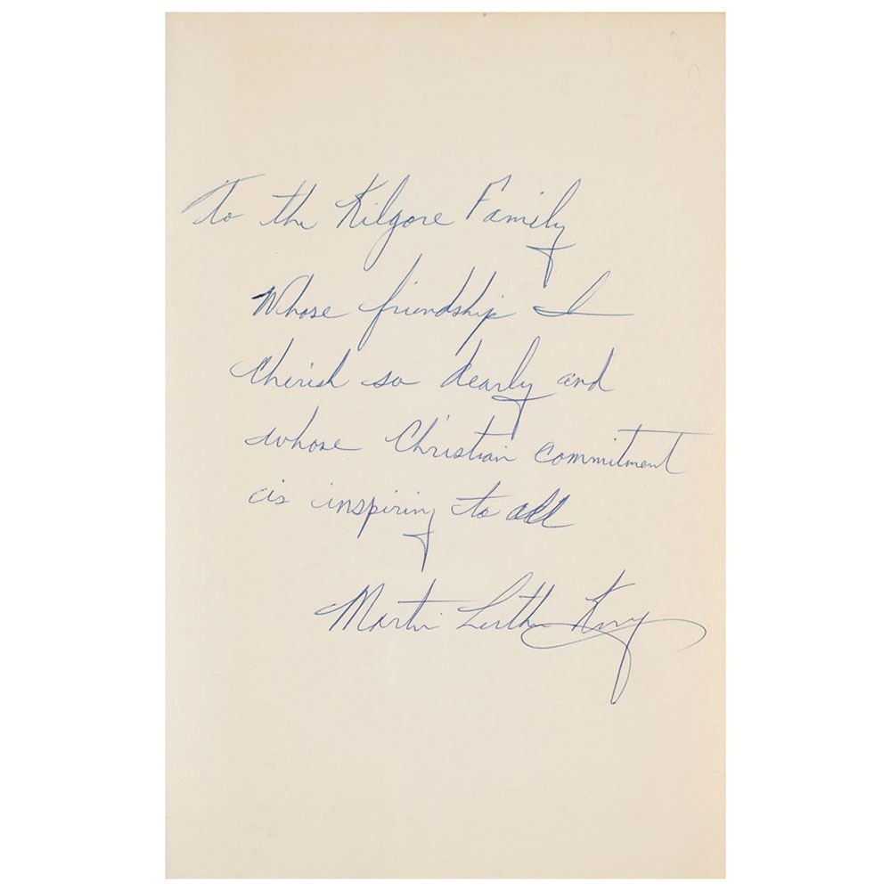 Signed book: Strength to Love. First edition. NY: Harper & Row, 1963. Hardcover with dust jacket, 5.75 x 8.75, 146 pages. Signed and inscribed on the first free end page in blue ballpoint, "To the Kilgore Family, Whose friendship I cherish so dearly and whose Christian commitment is inspiring to all, Martin Luther King." Autographic condition: fine. Book condition: VG/VG, with moderate rubbing and a few edge nicks to jacket.