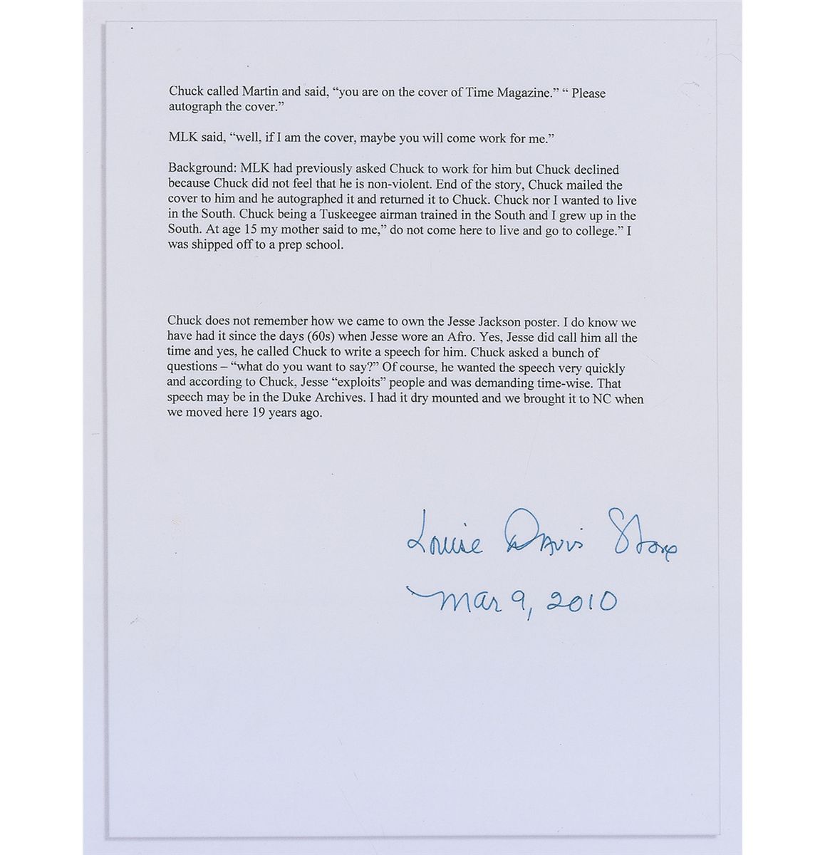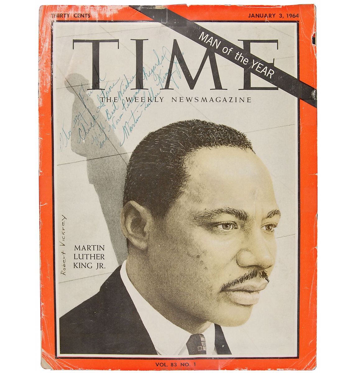 Additionally accompanied by a copy of a 2010 provenance letter from Chuck Stone’s wife Louise Davis Stone, reading in part: “Chuck called Martin and said, ‘you are on the cover of Time magazine,’ ‘Please autograph the cover.’ MLK said, ‘well, if I am the cover, maybe you will come work for me.’ Background: MLK had previously asked Chuck to work for him but Chuck declined because Chuck did not feel that he is non-violent. End of the story, Chuck mailed the cover to him and he autographed it and returned to Chuck.”