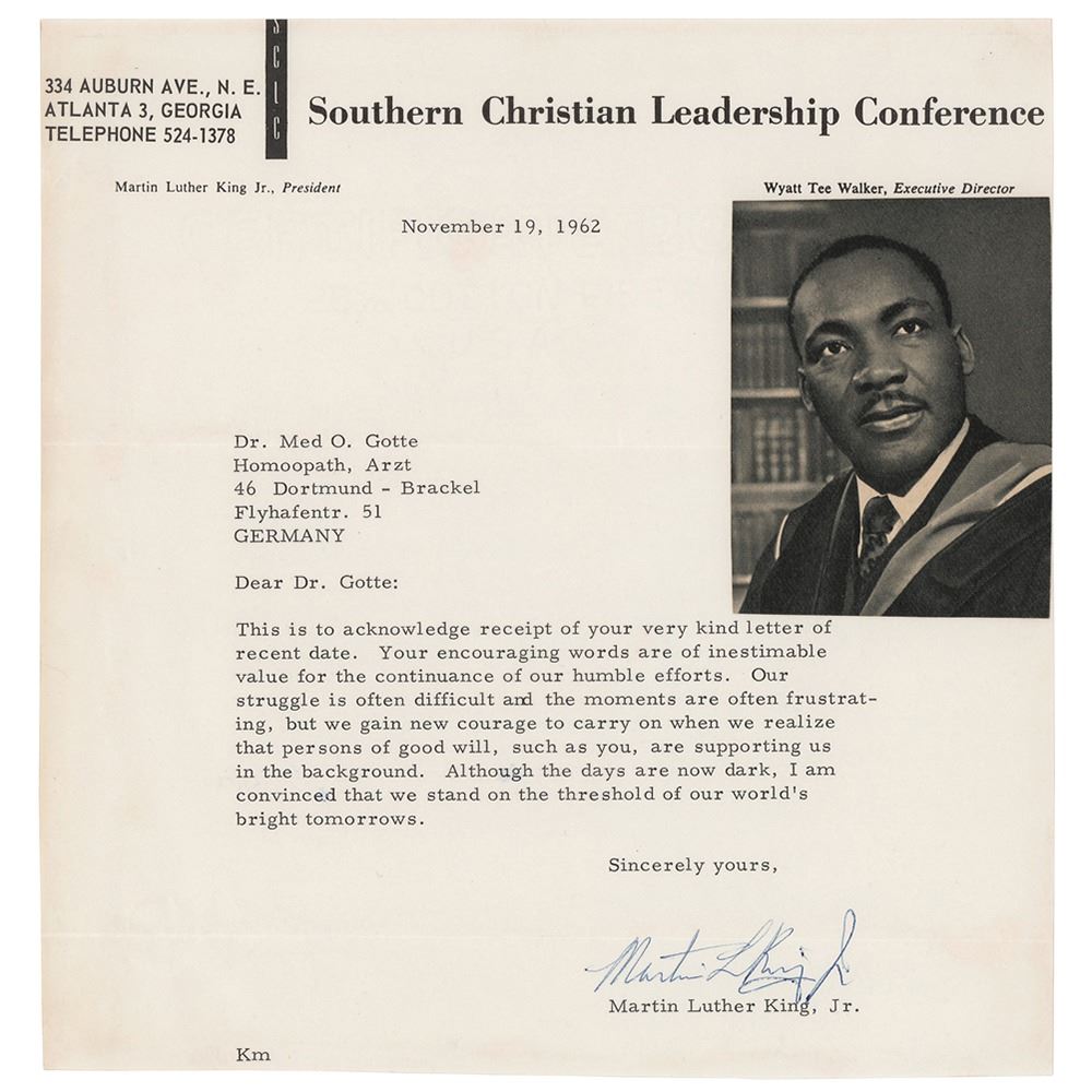 TLS signed "Martin L. King, Jr.," one page, 8.25 x 8.5, Southern Christian Leadership Conference letterhead, November 19, 1962. Letter to Dr. Med O. Gotte in Germany, in full: "This is to acknowledge receipt of your very kind letter of recent date. Your encouraging words are of inestimable value for the continuance of our humble efforts. Our struggle is often difficult and the moments are often frustrating, but we gain new courage to carry on when we realize that persons of good will, such as you, are supporting us in the background. Although the days are now dark, I am convinced that we stand on the threshold of our world's bright tomorrows." A clipped magazine photo of King is affixed to the right side of the letter. In fine condition, with trimmed edges. A fantastic message from King during tumultuous times of the Civil Rights Movement, bringing to life both his humility and the encouragement he received from supporters worldwide.