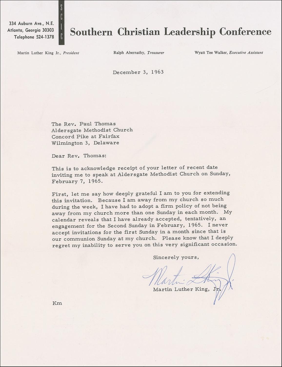 TLS signed “Martin L. King, Jr,” one page, 8.5 x 11, Southern Christian Leadership Conference letterhead, December 3, 1963. Letter to Reverend Paul Thomas, sent in response to his earlier letter. In full: “This is to acknowledge receipt of your letter of recent date inviting me to speak at the Aldersgate Methodist Church on Sunday, February 7, 1965. First, let me say how deeply grateful I am to you for extending this invitation. Because I am away from my church so much during the week, I have had to adopt a firm policy of not being away from my church more than one Sunday each month. My calendar reveals that I have already accepted, tentatively, an engagement for the Second Sunday in February, 1965. I never accept invitations for the first Sunday of the month since that is our communion Sunday at my church. Please know that I deeply regret my inability to serve you on the significant occasion.” In fine condition. Accompanied by the original mailing envelope, as well as the letter sent to King by Thomas offering the invitation for King to preach at the Sunday morning services on February 7, 1965.