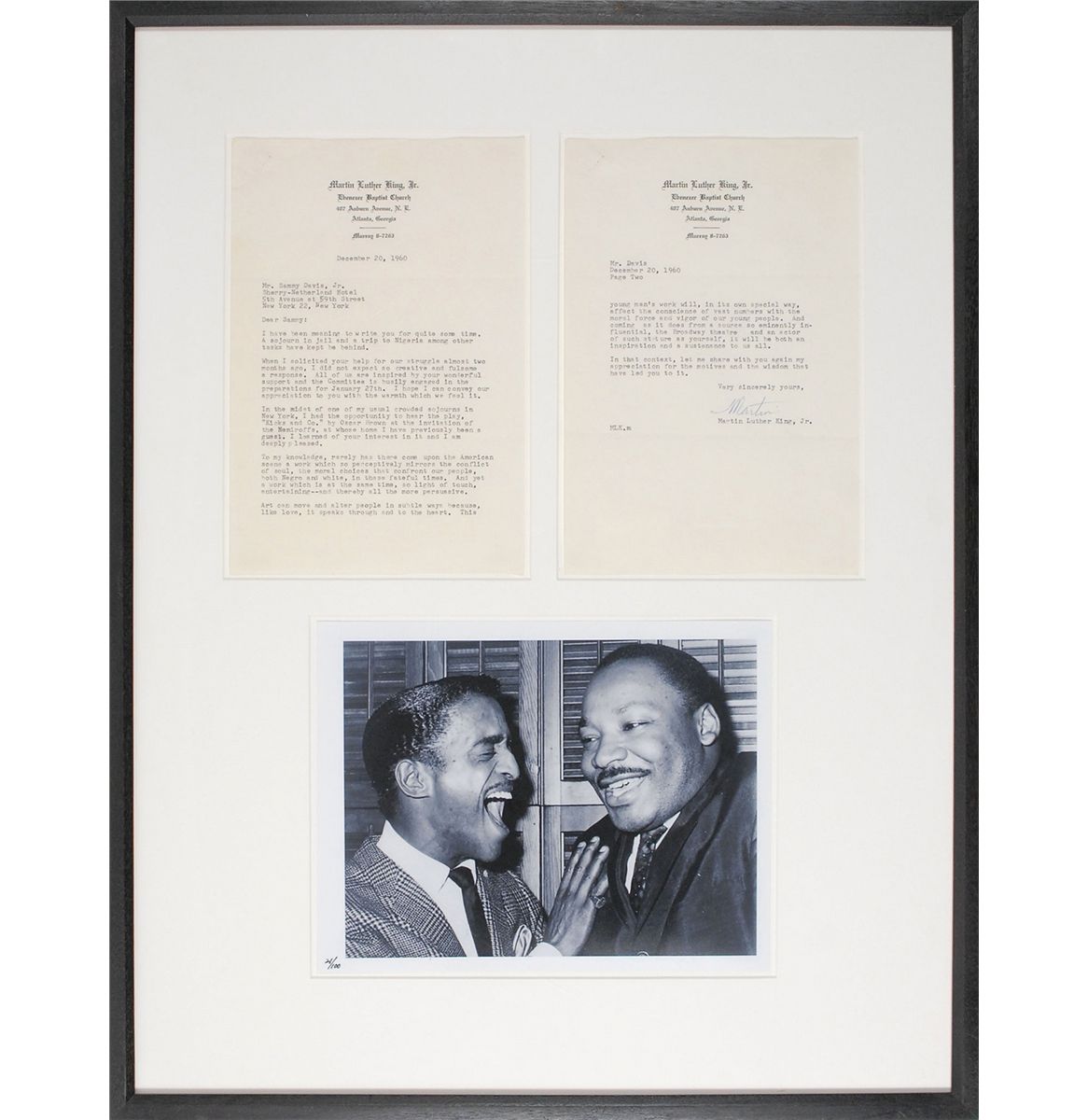 Art can move and alter people in subtle ways because, like love, it speaks through and to the heart. This young man's work will, in its own special way, affect the conscience of vast numbers with the moral force and vigor of our young people. And coming as it does from a source so eminently influential as yourself, it will be both an inspiration and a sustenance to us all. In that context, let me share with you again my appreciation for the motives and the wisdom that have led you to it.” Matted and framed with a portrait of King and Davis sharing a laugh to an overall size of 21 x 27. In fine condition, with a staple hole to top left corner of each page. Provenance: The Estate of Sammy Davis, Jr.