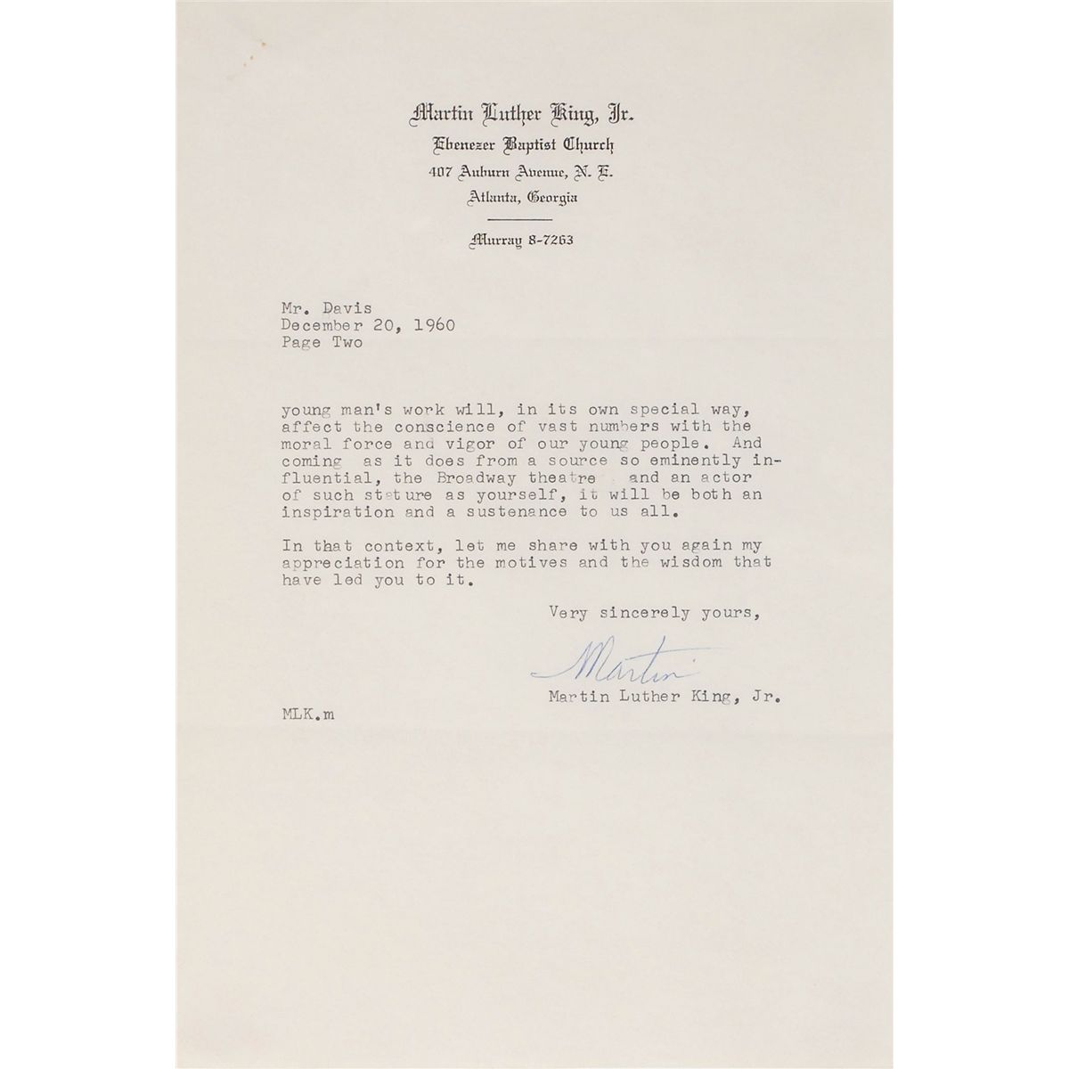 TLS signed “Martin,” two pages, 7 x 10.25, personal Ebenezer Baptist Church letterhead, December 20, 1960. Letter to Sammy Davis, Jr. In full: “I have been meaning to write you for quite some time. A sojourn in jail and a trip to Nigeria among other tasks have kept be [sic] behind. When I solicited your help for our struggle almost two months ago, I did not expect so creative and fulsome a response. All of us are inspired by your wonderful support and the Committee is busily engaged in the preparations for January 27th. I hope I can convey our appreciation to you with the warmth which we feel it.