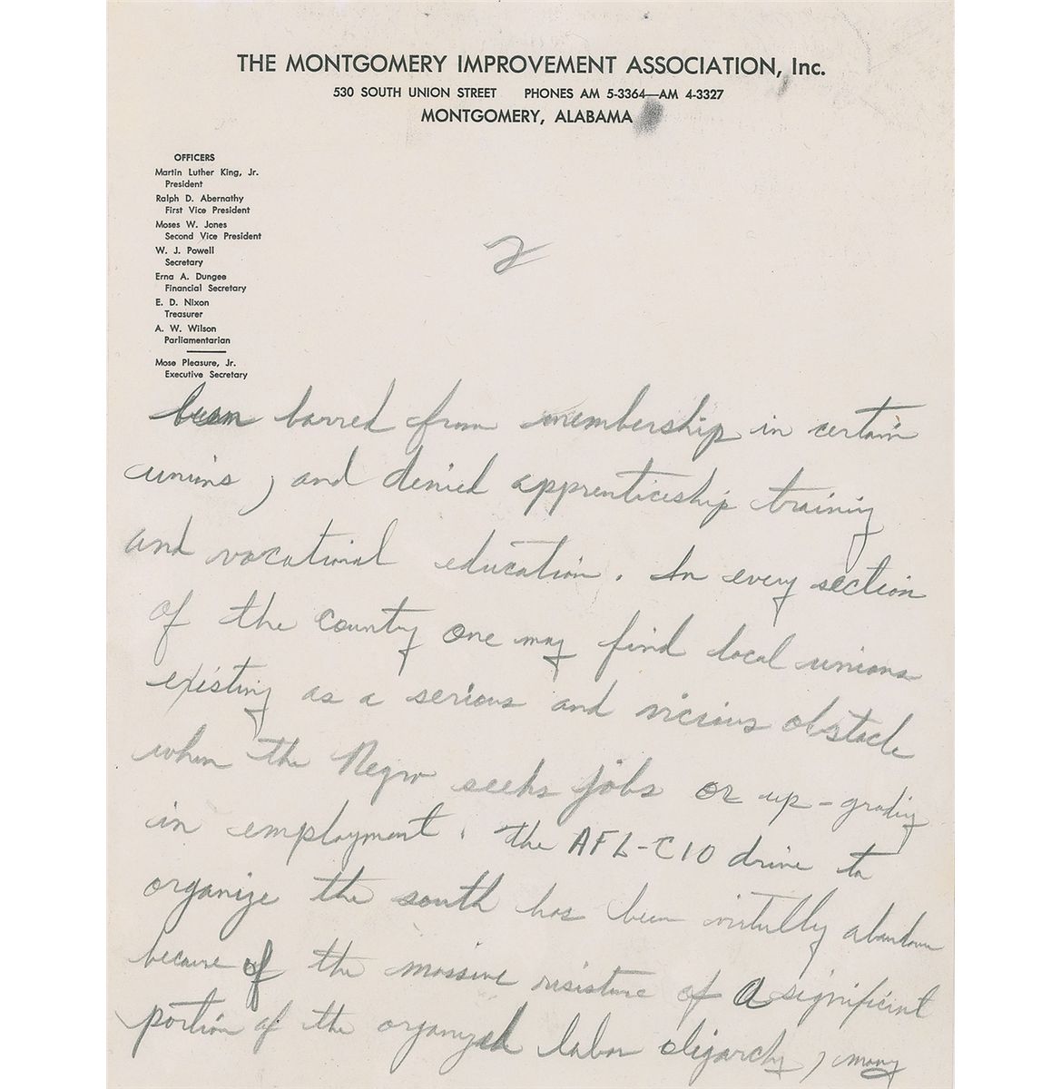 Autograph manuscript, unsigned, in pencil, one page, 8.5 x 11, Montgomery Improvement Association, Inc., letterhead listing King as President, no date, but circa 1957–58. Second page of a longer draft reads, in full: “been barred from membership in certain unions, and denied apprenticeship training and vocational education. In every section of the country one may find local unions existing as a serious and vicious obstacle when the Negro seeks jobs or up-grading in employment. The AFL-CIO drive to organize the south has been virtually abandon [sic] because of the massive resistance of a significant portion of the organized labor oligarchy, many.” Page has been removably encapsulated in acid-free Mylar. In fine condition, with professional silking to reverse and a couple of smudges to letterhead.