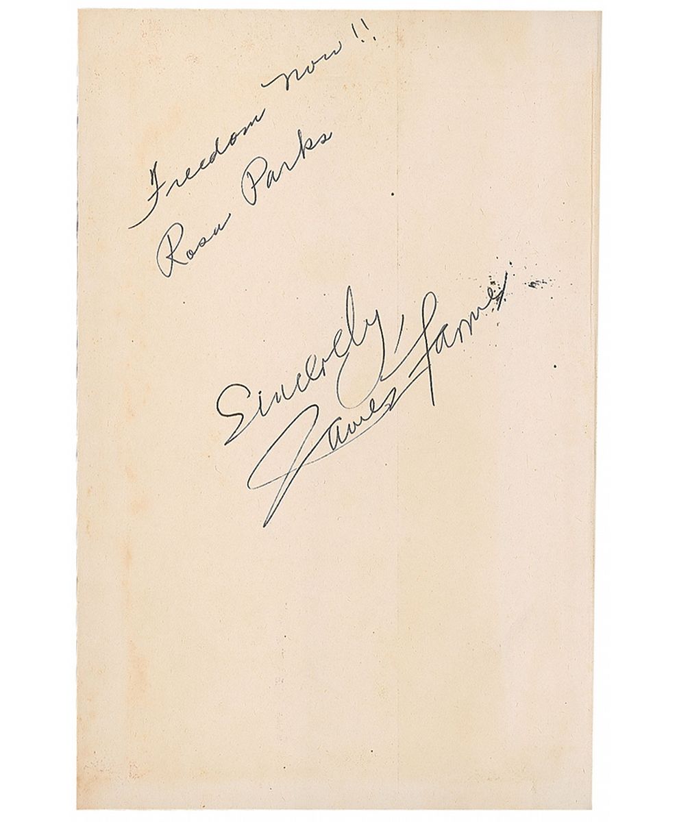 Signed book: The Desegregated Heart. First edition, later printing. NY: William Morrow and Company, 1962. Hardcover, 5.75 x 8.5, 364 pages. Signed in blue ballpoint on the first free end page, “Best wishes, Martin Luther King, Jr.,” and also signed in ballpoint on the first free end page and front pastedown, “Freedom Now!! Rosa Parks,” “Sincerely, James Farmer,” “Best wishes Ralph David Abernathy,” “Aaron E. Henry,” “James T. Bevel,” “Bayard Rustin,” and “Wyatt Tee Walker.” Autographic condition: fine, with a few light spots and some scattered light toning to pastedown and first free end page, none affecting King’s signature. Book condition: VG/G. An outstanding and possibly unique collection of civil rights pioneers, as King and Parks are seldom—if ever—seen on the same item.