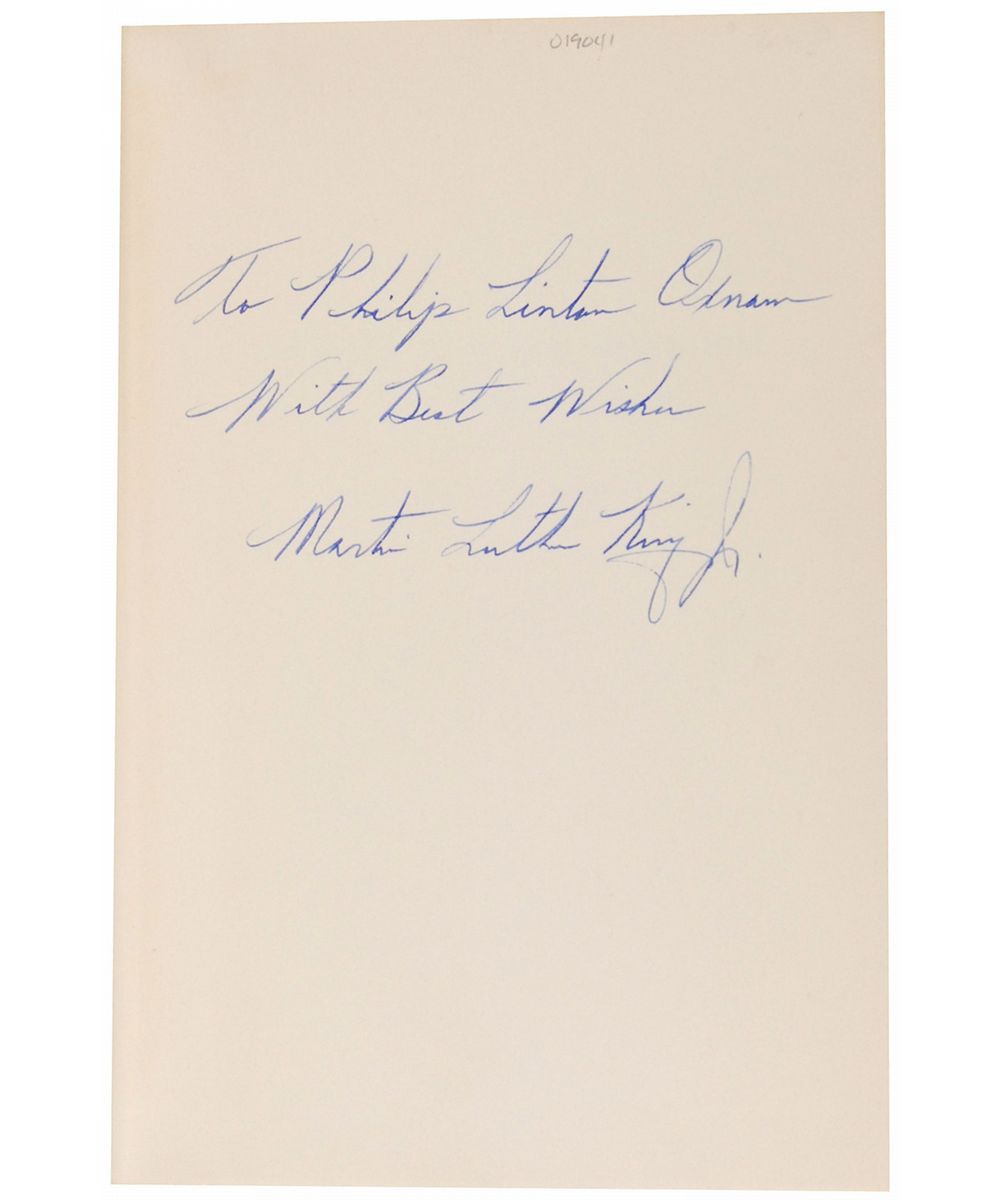 Signed book: Stride Toward Freedom. Later printing. NY: Harper & Row, 1958. Hardcover with dust jacket, 5.75 x 8.25, 230 pages. Beautifully signed and inscribed on the first free end page in fountain pen, “To Philip Linton Oxnam, With Best Wishes, Martin Luther King, Jr.” Autographic condition: fine to very fine. Book condition: VG+/VG. A fantastic example of this much sought-after Civil Rights leader.