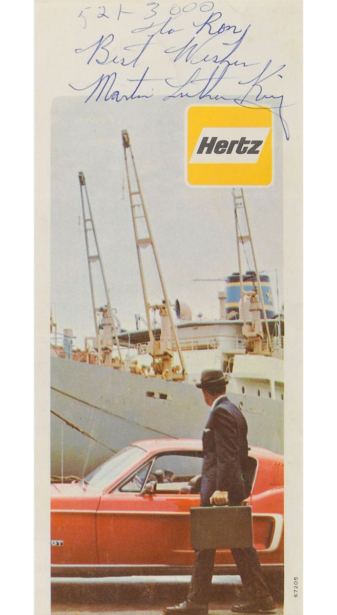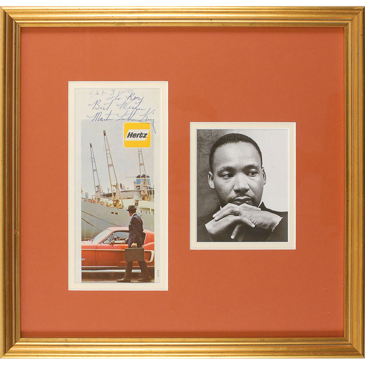 A Hertz rental car pamphlet, 3.5 x 8, signed and inscribed at the top in blue ballpoint, “To Roy, Best wishes, Martin Luther King.” A notation on the reverse, now obscured by framing, dates the signature to February 2, 1968. Handsomely double-matted and framed with a portrait of the civil rights leader to an overall size of 15 x 14.5. Various ballpoint notations at the top and very subtle foxing, otherwise fine condition.