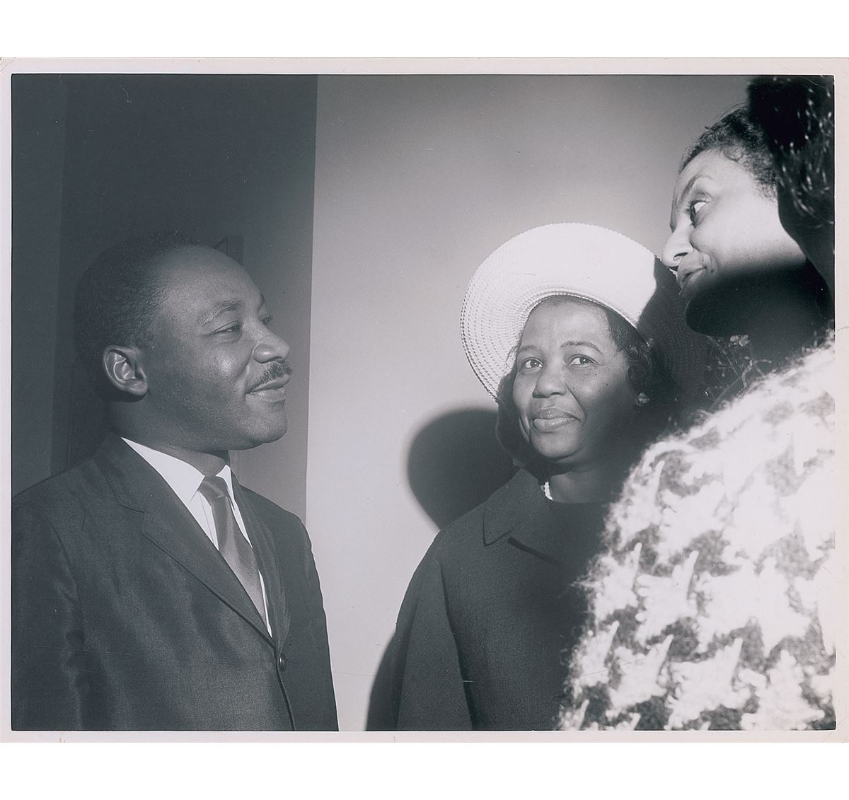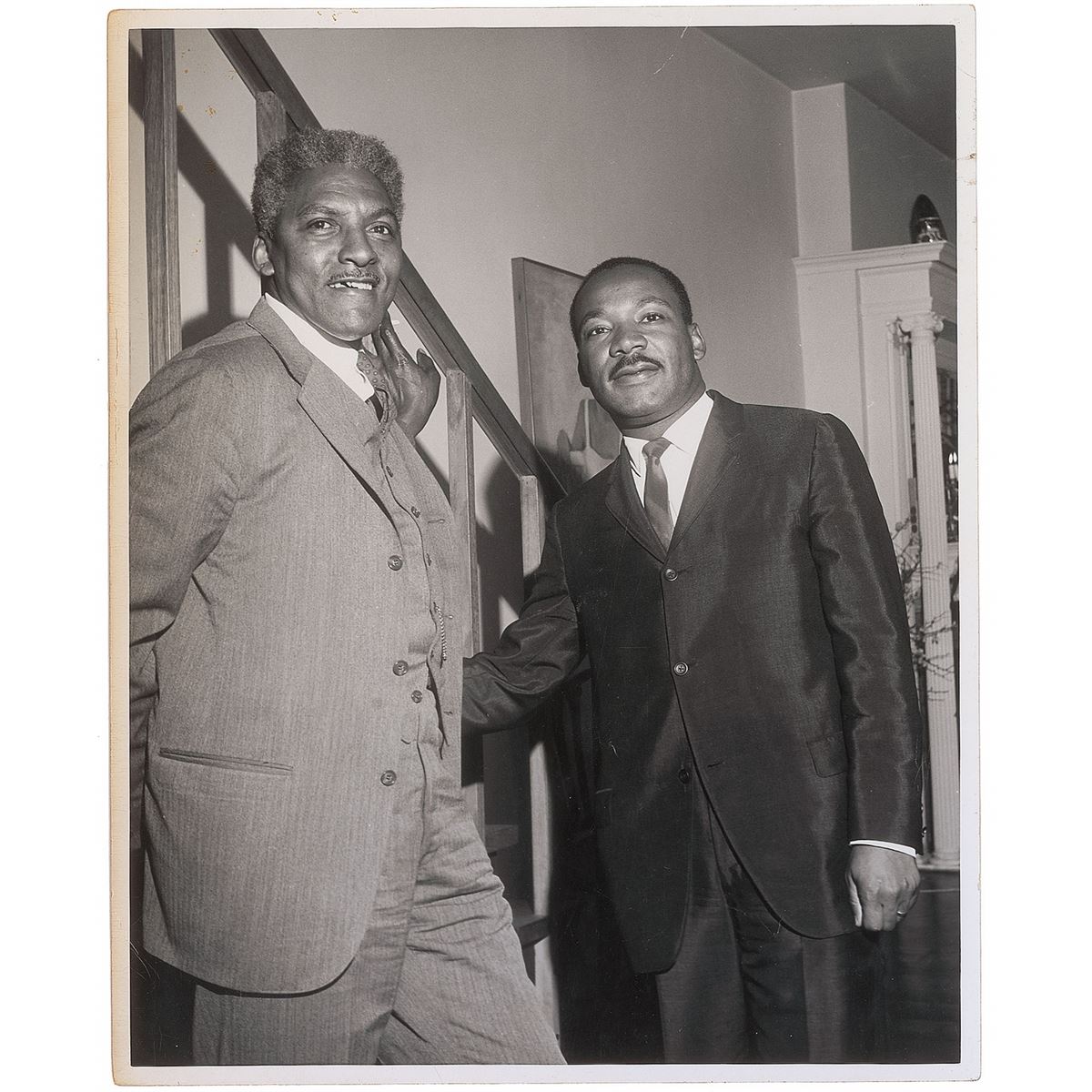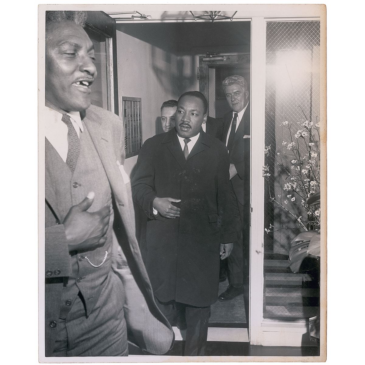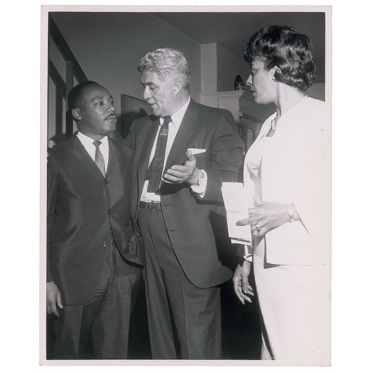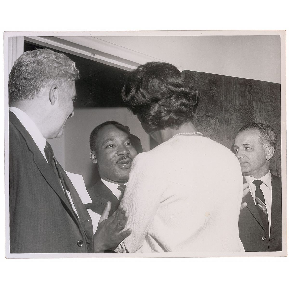 Five handsome first-generation candid glossy photos, 8 x 10 and 10 x 8, all prominently featuring King meeting with and greeting others. One is stamped on the reverse by “Bert Smith Photos.” Scattered creasing and rippling (heaviest to the photo with a staircase in the background), otherwise overall fine condition. From the collection of Warren Arthur ‘Chip’ Logan.