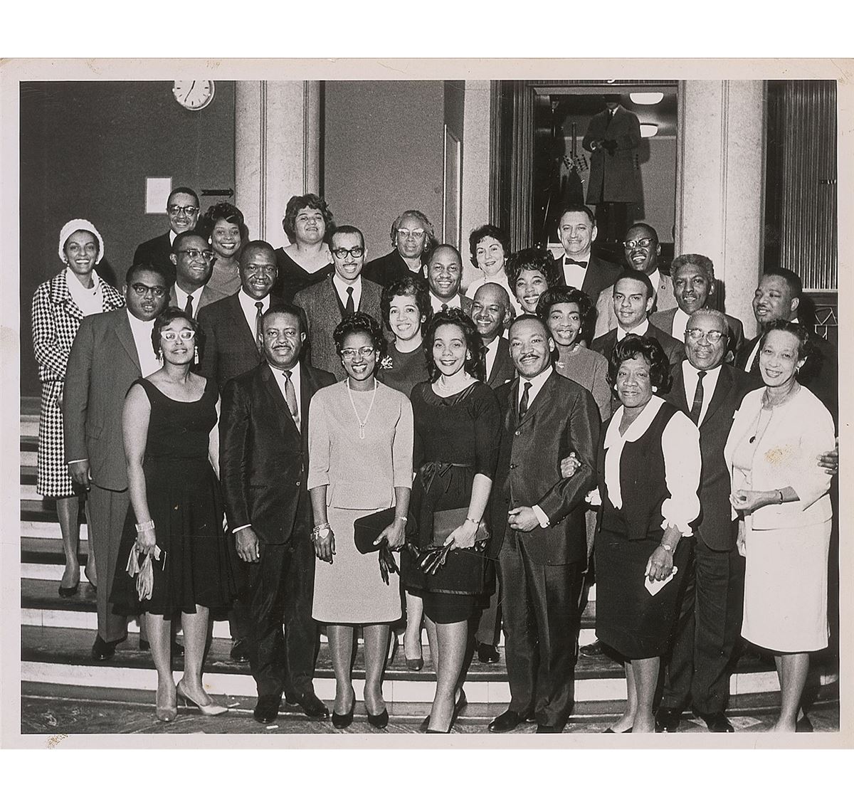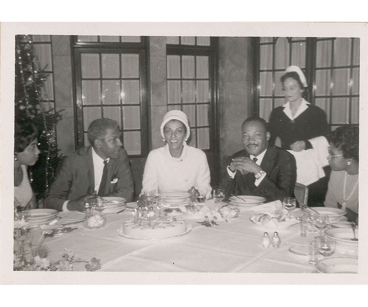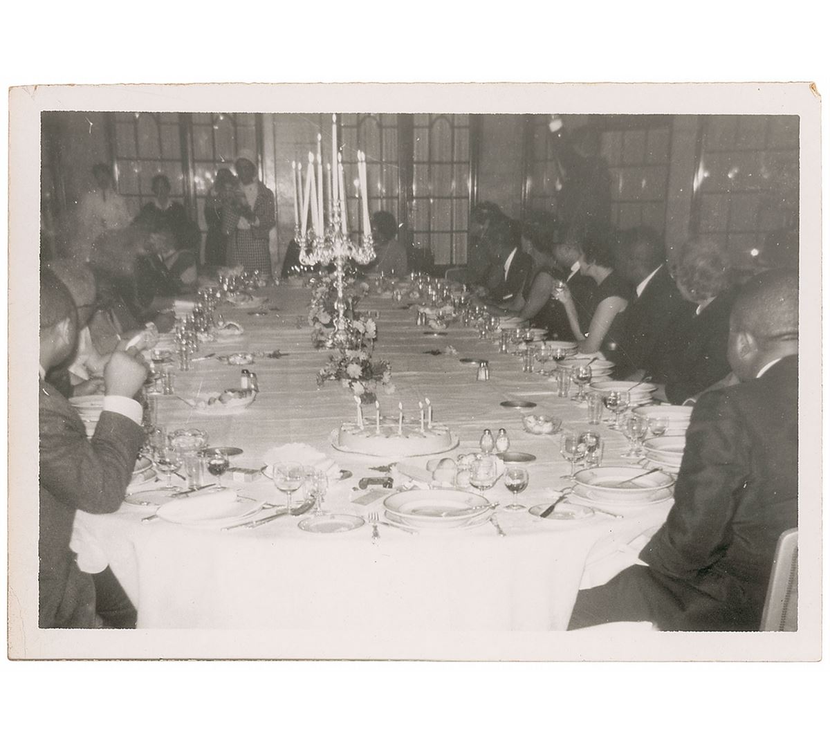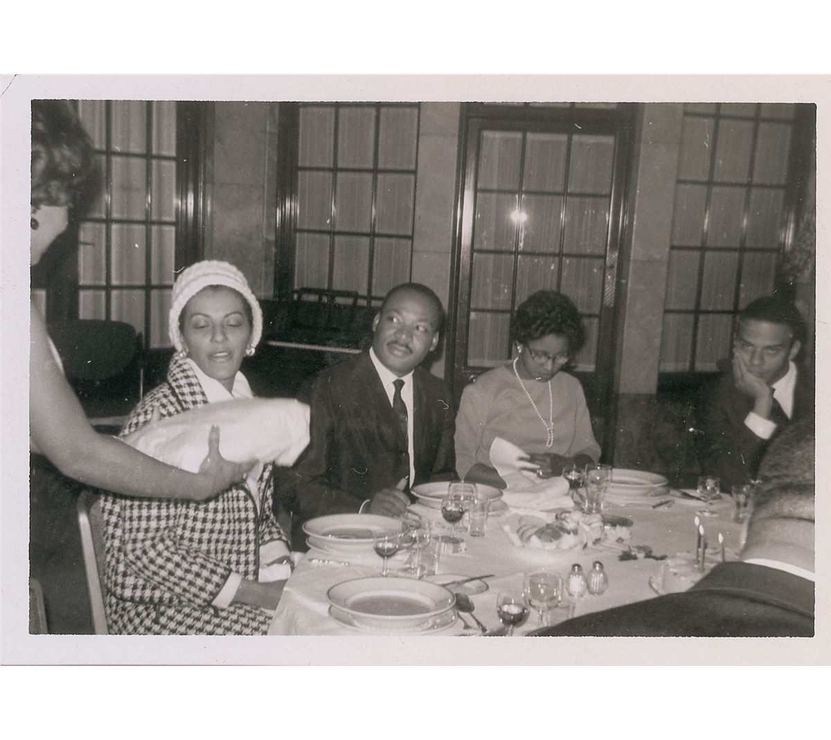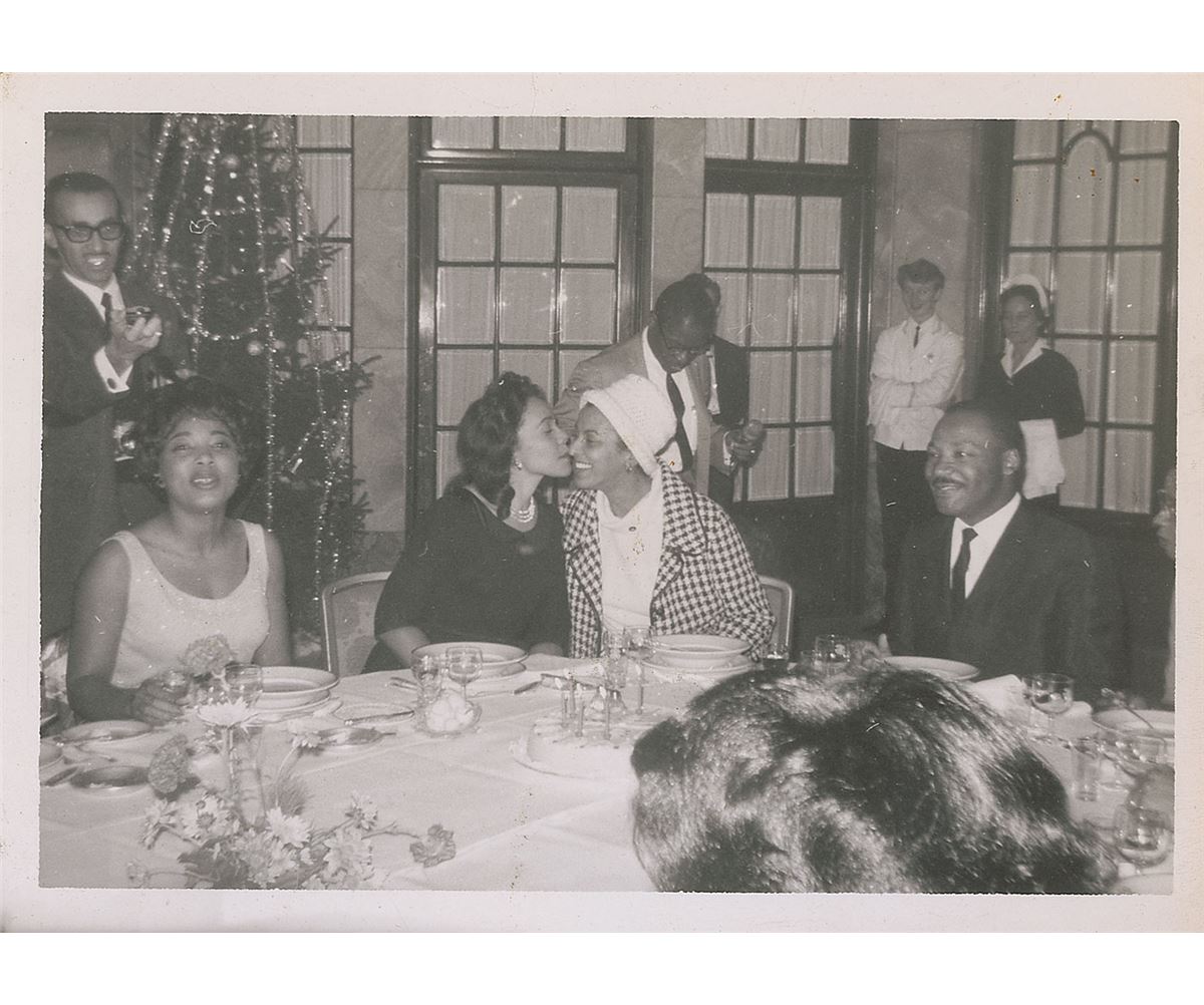 Five first-generation glossy photos from a dinner during King’s trip to Oslo to receive the 1964 Nobel Peace Prize, including four 7 x 5 candid shots from the dinner and one 10 x 8 photo of the traveling party. The larger photo bears the photographer’s stamp of Pulitzer Prize–winning photographer Moneta Sleet, Jr., of Ebony magazine. In overall fine condition, with light scattered creases. From the collection of Warren Arthur ‘Chip’ Logan.