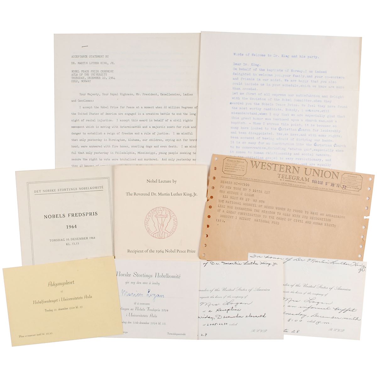 Collection of material related to King’s acceptance of the 1964 Nobel Peace Prize, including: a small booklet of King’s ‘Nobel Lecture’ printed by Harper & Row in a limited edition of 2,000 copies “for distribution to friends of the House and of Dr. King”; two invitation cards from the ambassador of the United States to Norway for an informal buffet and a reception in honor of King to be held at the Villa Otium ambassador’s residence in Oslo; two cards in Norwegian, one for the Nobel ceremony on December 10, 1964, and one for King’s Nobel Prize lecture on the next day; a program in Norwegian for the Nobel Peace Prize ceremony on December 10; a carbon copy of the typed welcoming statement issued to the traveling party; a printed typescript of King’s acceptance statement; and a Western Union telegram from Dorothy I. Height to Marian Bruce, thanking her for being an ambassador for the National Council of Negro Women in the mission to Oslo. In overall fine condition. Accompanied by original transmittal envelopes for the invitations. From the collection of Warren Arthur ‘Chip’ Logan.