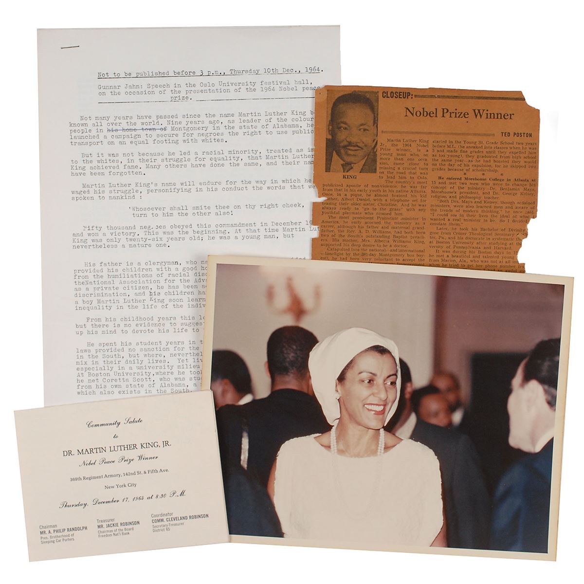 Four items related to King’s acceptance of the 1964 Nobel Peace Prize, including: a program for a ‘Community Salute to Dr. Martin Luther King, Jr., Nobel Peace Prize Winner,’ held in New York on December 17, 1964; a printed typescript of the speech given by Gunnar Jahn, chairman of the Nobel Committee, at the award ceremony in Oslo on December 10, six pages, 8.5 x 11, headed “Not to be published before 3 p.m., Thursday 10th Dec., 1964”; a semi-glossy color 10 x 8 photo of Marian Bruce Logan at the Nobel Prize ceremony; and a newspaper clipping about the event. In overall very good to fine condition. From the collection of Warren Arthur ‘Chip’ Logan.