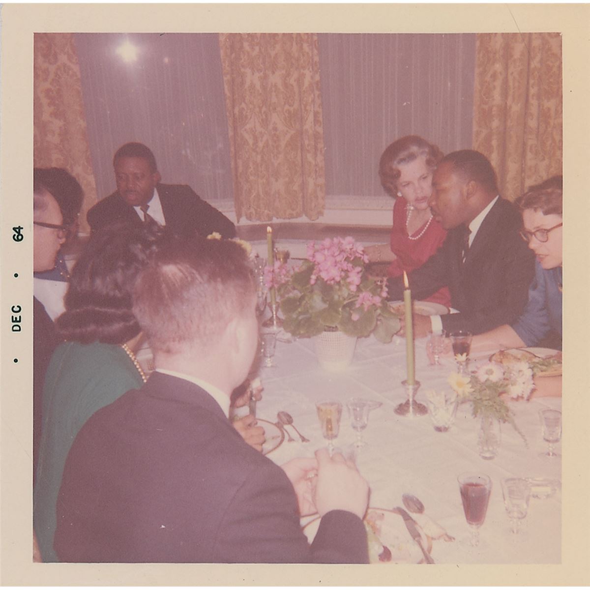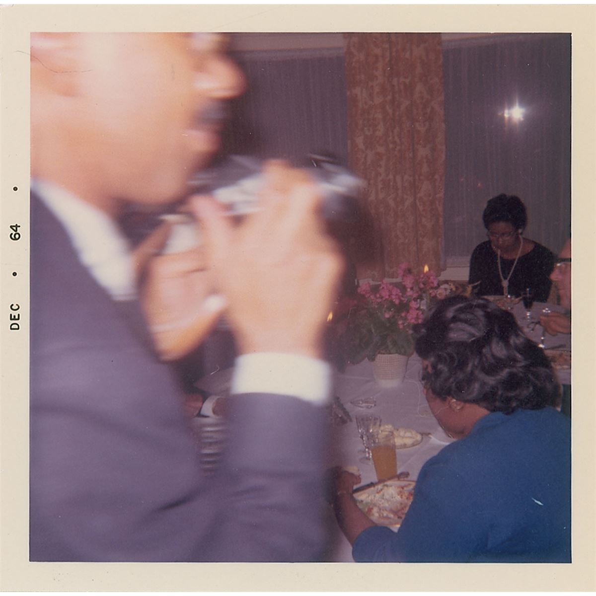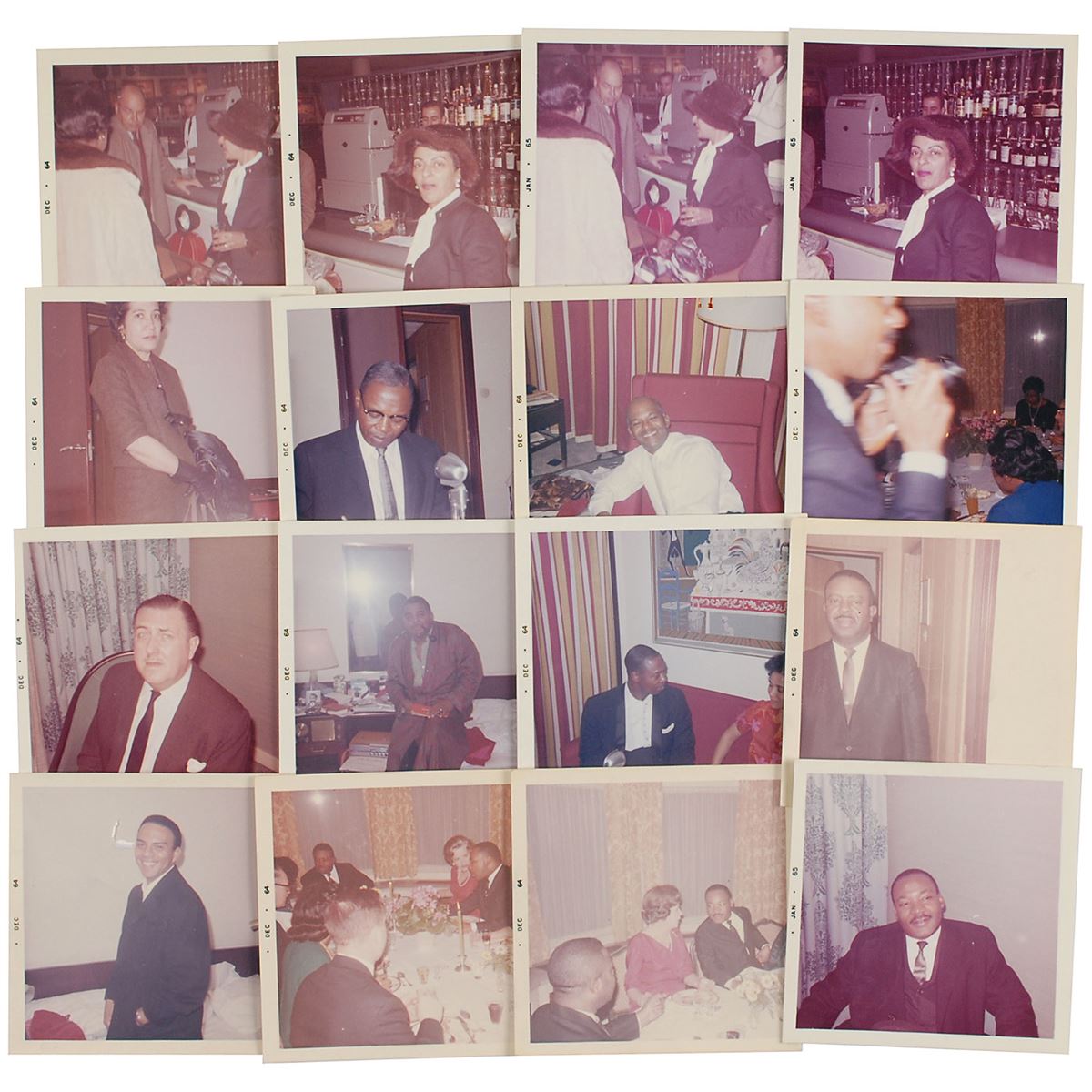 Collection of sixteen original color glossy 3.5 x 3.5 candid snapshots dated from December 1964 to January 1965, including three depicting Martin Luther King, Jr., one of Andrew Young, one of Ralph Abernathy, and the balance of other event and reception attendees. Some creases and rippling due to adhesive remnants to reverse, and a tear to the photo of Young, otherwise overall fine condition. From the collection of Warren Arthur ‘Chip’ Logan.