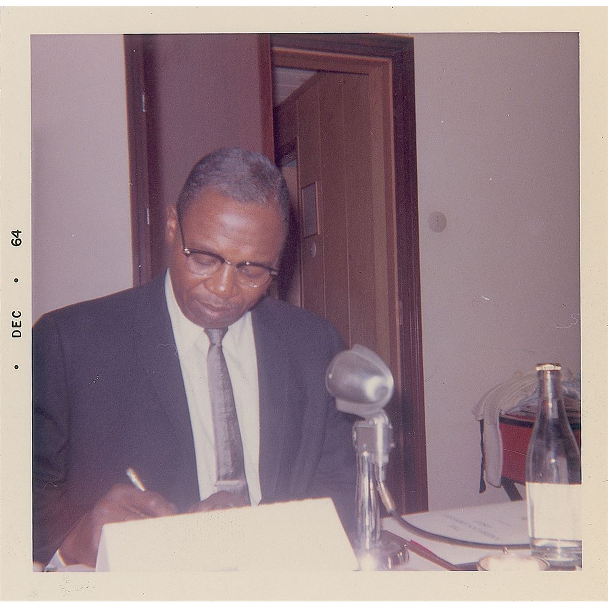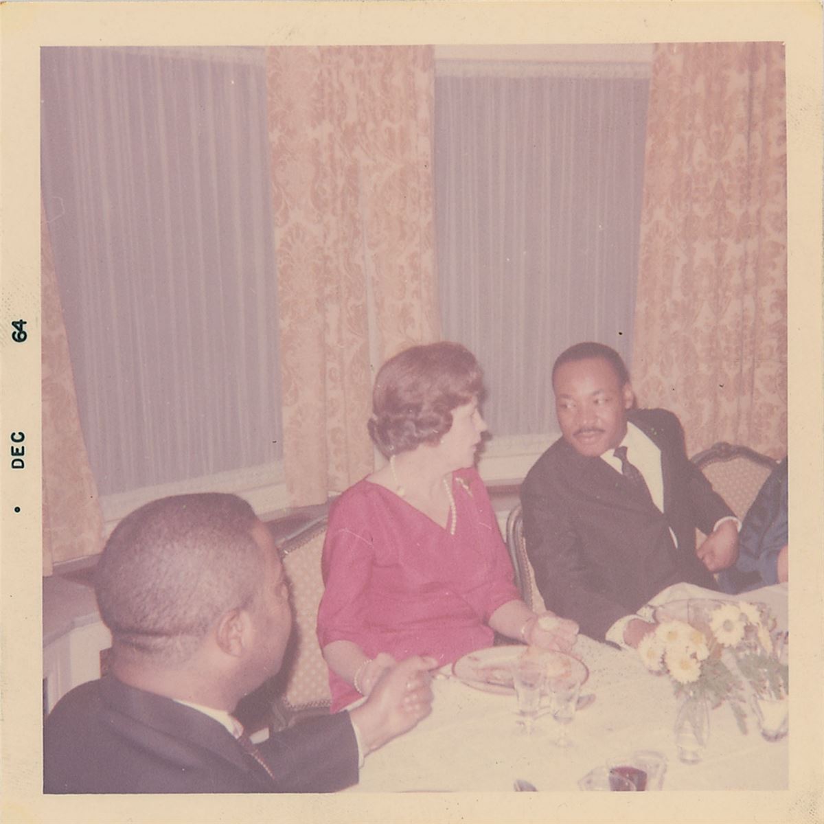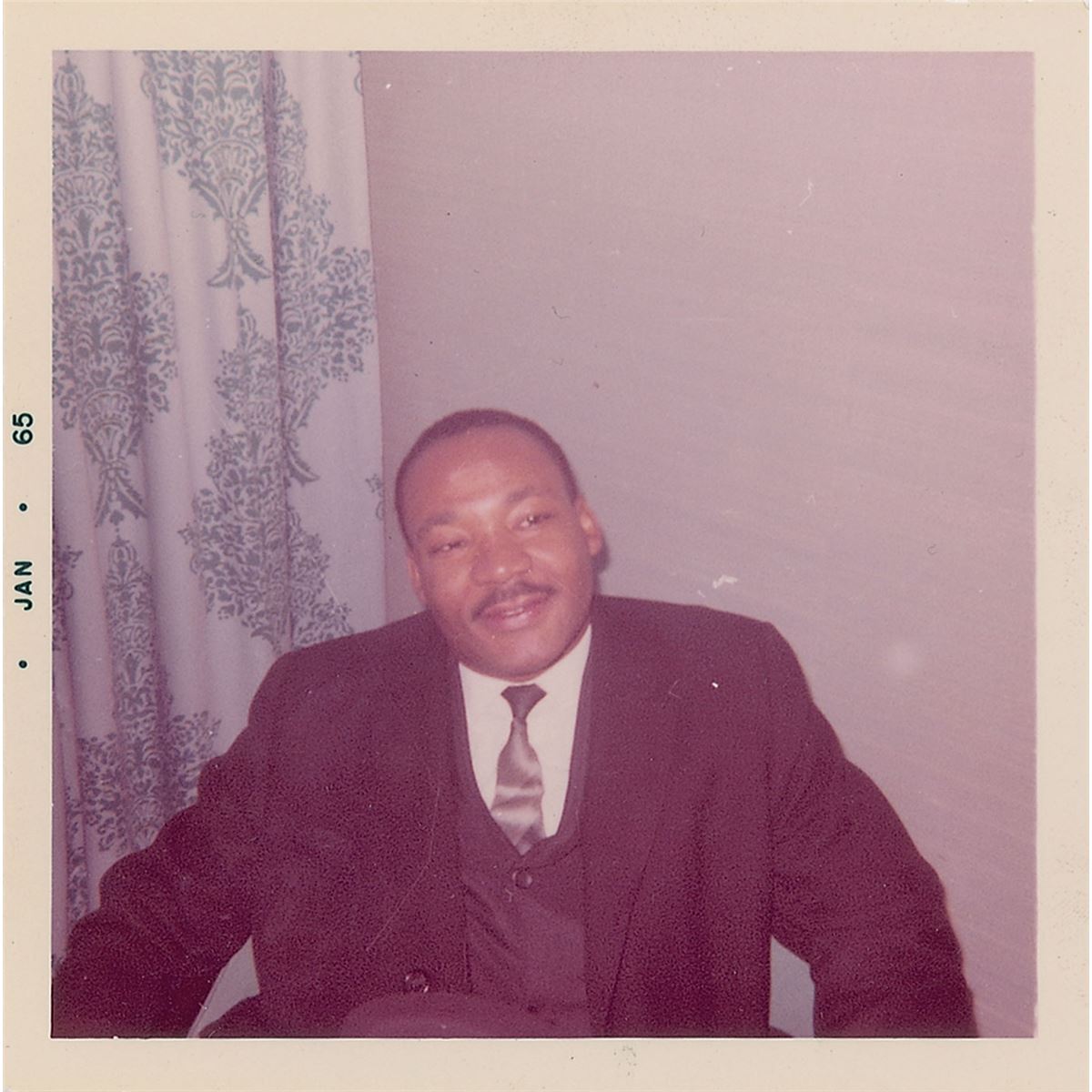 Collection of sixteen original color glossy 3.5 x 3.5 candid snapshots dated from December 1964 to January 1965, including three depicting Martin Luther King, Jr., one of Andrew Young, one of Ralph Abernathy, and the balance of other event and reception attendees. Some creases and rippling due to adhesive remnants to reverse, and a tear to the photo of Young, otherwise overall fine condition. From the collection of Warren Arthur ‘Chip’ Logan.