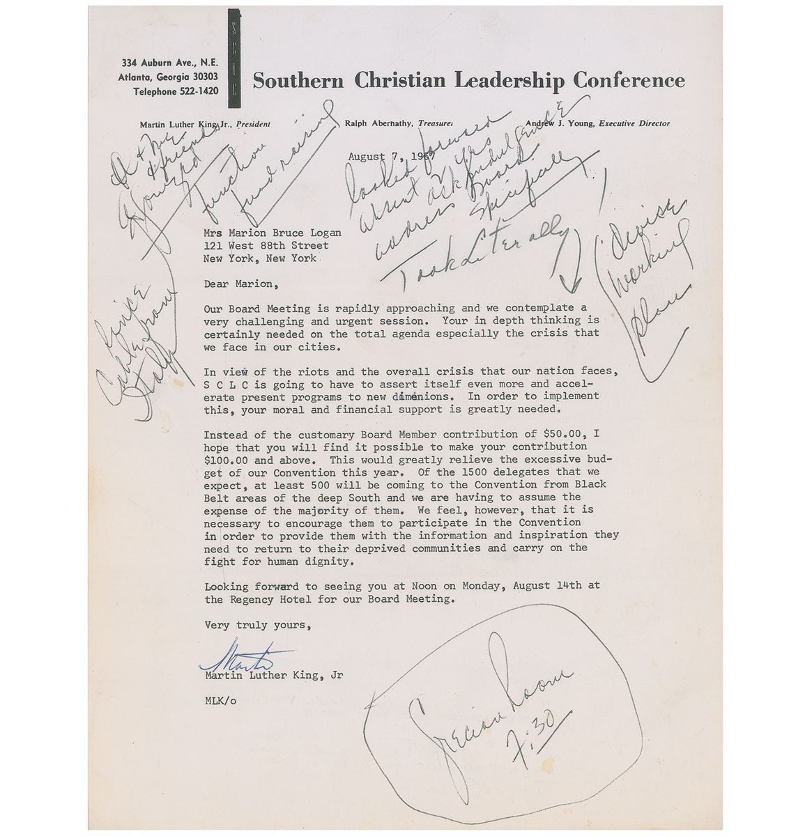TLS signed “Martin,” one page, 8.5 x 11, Southern Christian Leadership Conference letterhead, August 7, 1967. Letter to Marian Bruce Logan. In part: “Our Board Meeting is approaching and we contemplate a very challenging and urgent session. Your in depth thinking is certainly needed on the total agenda especially the crisis that we face in our cities. In view of the riots and the overall crisis that our nation faces, SCLC is going to have to assert itself even more and accelerate present programs to new dimensions. In order to implement this, your moral and financial support is greatly needed…Of the 1500 delegates that we expect, at least 500 will be coming to the Convention from Black Belt areas of the deep South and we are having to assume the expense of the majority of them. We feel, however, that it is necessary to encourage them to participate in the Convention in order to provide them with the information and inspiration they need to return to their deprived communities and carry on the fight for human dignity.” Bruce added several pencil and ballpoint notations to the margins. In fine condition, with mild creases and a few trivial stains. From the collection of Warren Arthur ‘Chip’ Logan.