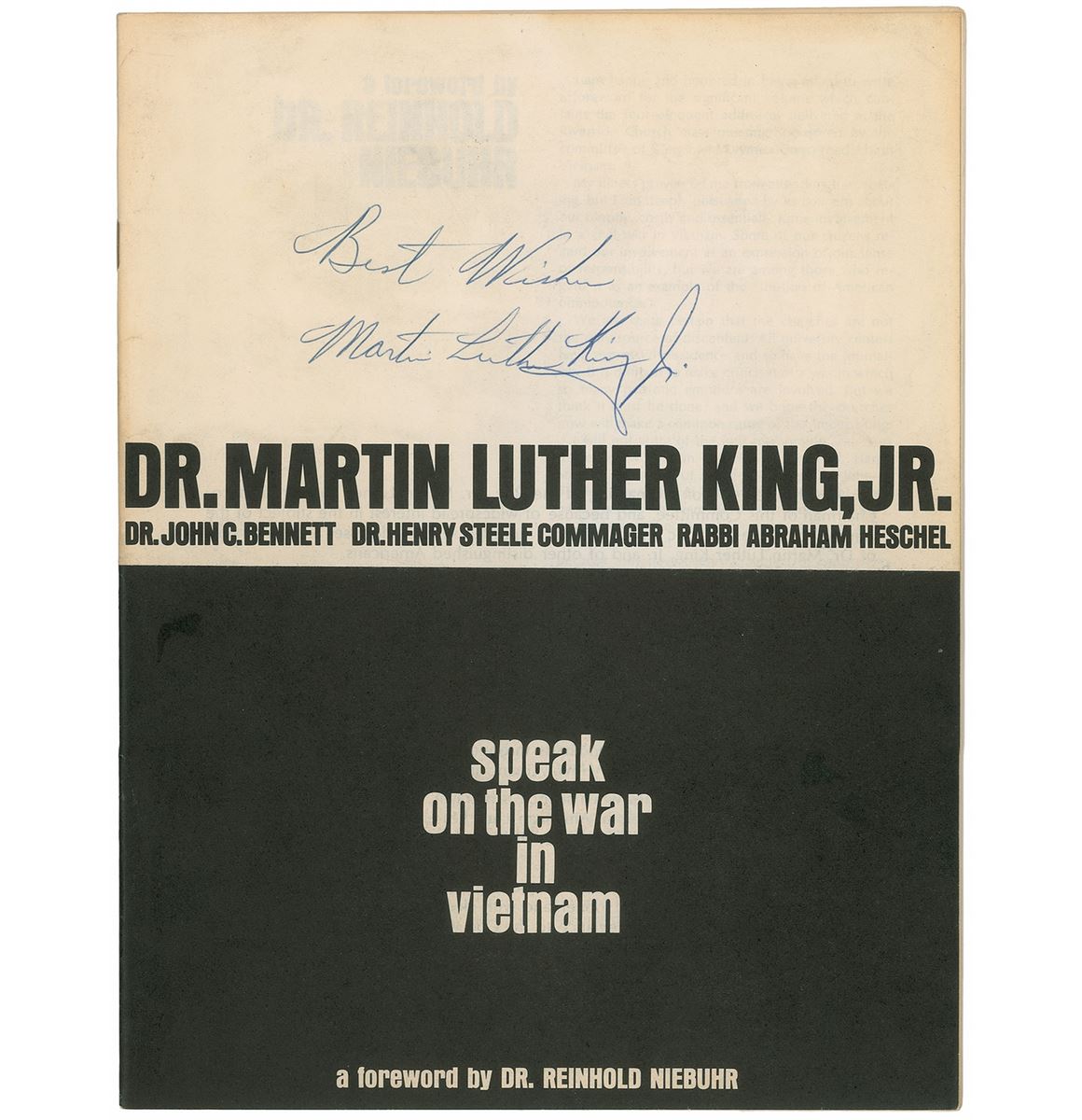 Publication by the Clergy and Laymen Concerned About Vietnam, entitled ‘Speak on the War in Vietnam,’ thirty pages, 8.25 x 10.75, April 1967, signed on the cover in blue ballpoint, “Best Wishes, Martin Luther King, Jr.” The booklet contains two of King’s speeches on the war, including ‘The Casualties of the War in Vietnam,’ given at The Nation Institute in Los Angeles on February 25, 1967, and ‘Beyond Vietnam,’ given at Riverside Church on April 4. Also includes addresses given by several other figures at the April 4 event and a transcript of the subsequent question and answer session. Additional material published in the booklet includes a New York Times interview with King and his comments on the NAACP resolution of April 12, 1967. In fine condition, with edge toning and mild soiling to covers. King’s ‘Beyond Vietnam’ was one of his most important addresses and also one of his most controversial—he opposed the war but remained quiet about it until this point, fearing that involving himself in international affairs would interfere with civil rights progress on the domestic front. An extraordinary signed piece from one of the most tumultuous periods in American history. From the collection of Warren Arthur ‘Chip’ Logan.