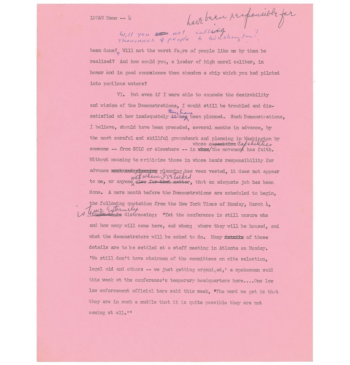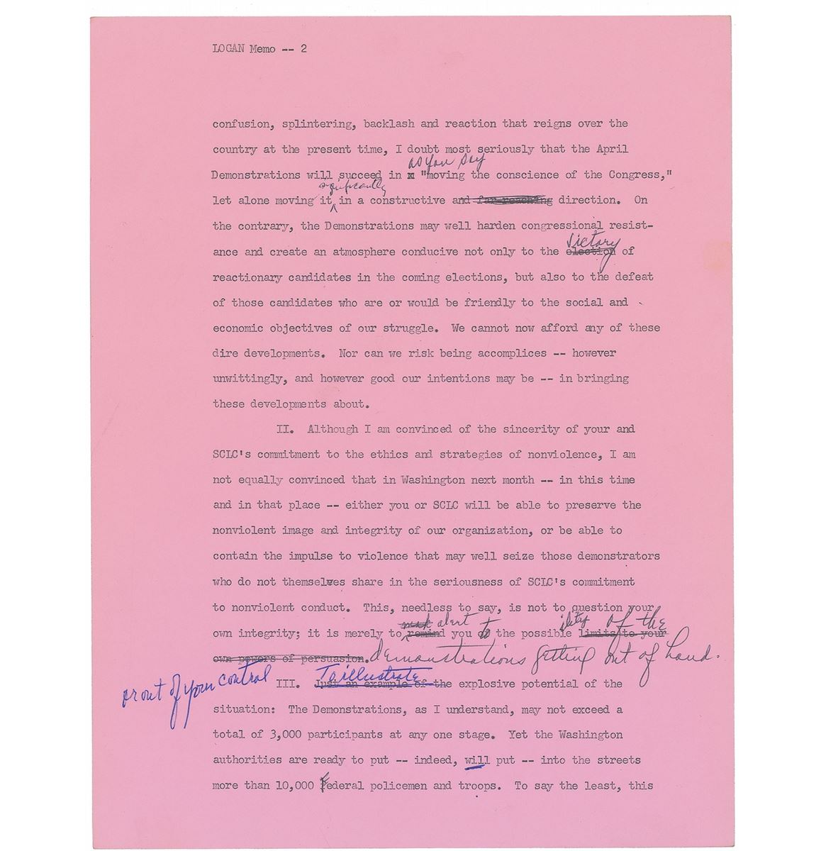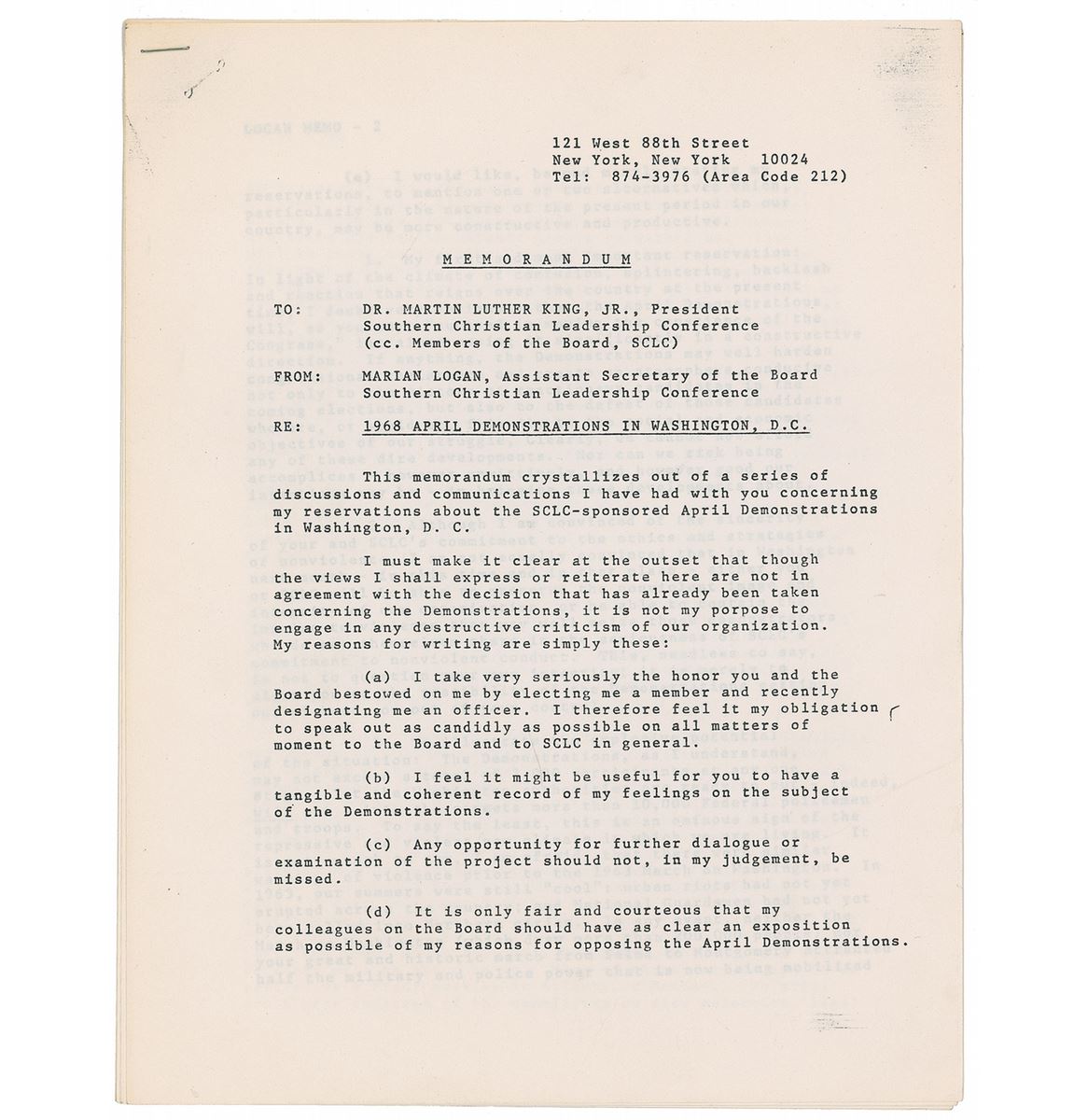 Two typed memos from Marian Bruce Logan to Martin Luther King, Jr., each six pages, 8.5 x 11, March 8, 1968, one of which is a draft extensively corrected and edited and the other a final typed version incorporating the revisions. The final draft is headed “1968 April Demonstrations in Washington D.C.,” in part: “This memorandum crystallizes out of a series of discussions and communications I have had with you concerning my reservations about the SCLC-sponsored April Demonstrations in Washington, D.C…To illustrate the explosive potential of the situation: The Demonstrations, as I understand, may not exceed a total of 3,000 participants at any one stage. Yet the Washington authorities are ready to put—indeed, will put—into the streets more than 10,000 Federal policemen and troops. To say the least, this is an ominous sign of the repressive and violent new climate in which we are living.” In overall fine condition. From the collection of Warren Arthur ‘Chip’ Logan.
