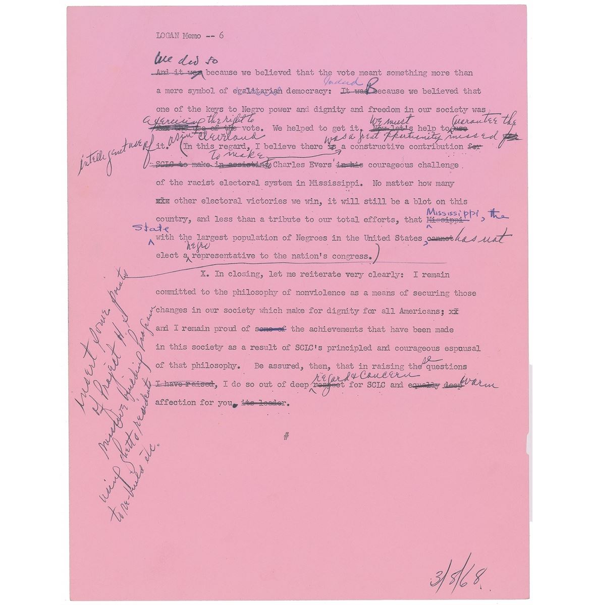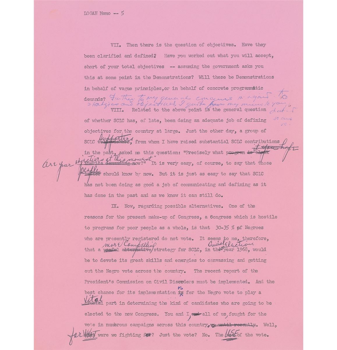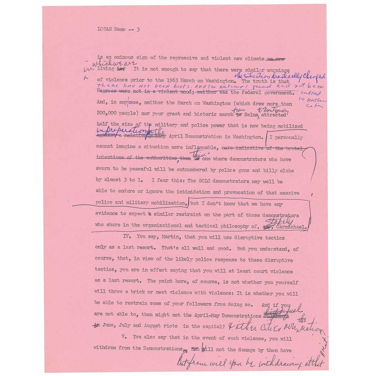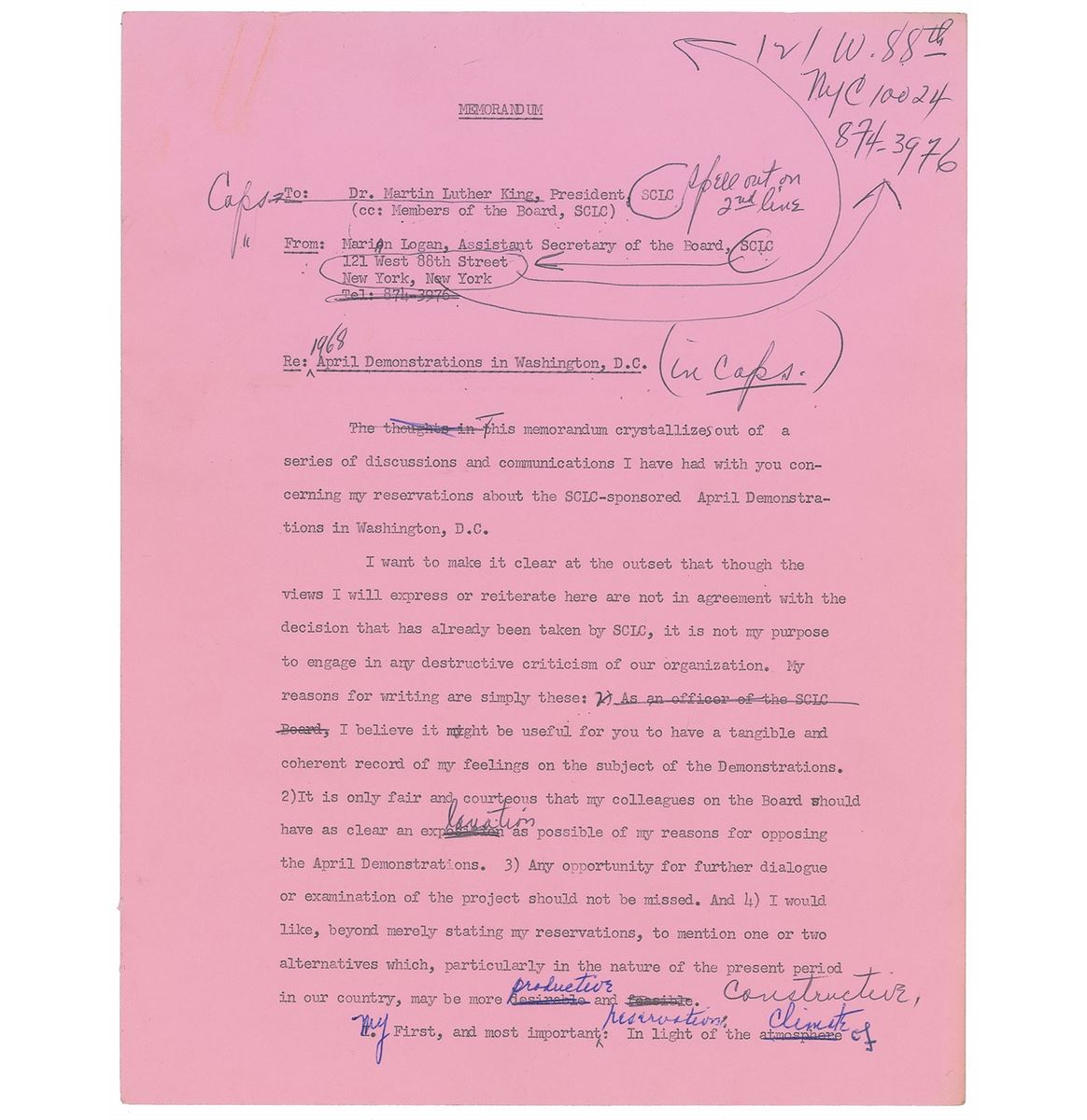 Two typed memos from Marian Bruce Logan to Martin Luther King, Jr., each six pages, 8.5 x 11, March 8, 1968, one of which is a draft extensively corrected and edited and the other a final typed version incorporating the revisions. The final draft is headed “1968 April Demonstrations in Washington D.C.,” in part: “This memorandum crystallizes out of a series of discussions and communications I have had with you concerning my reservations about the SCLC-sponsored April Demonstrations in Washington, D.C…To illustrate the explosive potential of the situation: The Demonstrations, as I understand, may not exceed a total of 3,000 participants at any one stage. Yet the Washington authorities are ready to put—indeed, will put—into the streets more than 10,000 Federal policemen and troops. To say the least, this is an ominous sign of the repressive and violent new climate in which we are living.” In overall fine condition. From the collection of Warren Arthur ‘Chip’ Logan.