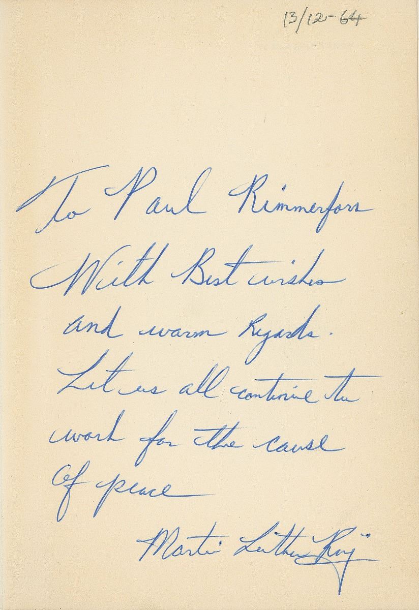 Signed book: Vi Kan Inte Vanta [Why We Can't Wait]. Later printing. Stockholm, Sweden: Gummesons Bokforlag, 1964. Hardcover with dust jacket, 5.5 x 7.5, 178 pages. Warmly signed and inscribed on the first free end page in blue ballpoint, “To Paul Rimmerfors, With best wishes and warm regards. Let us all continue the work for the cause of peace, Martin Luther King.” A notation to the upper right corner notes that it was signed on December 13, 1964. Autographic condition: fine. Book condition: VG+/VG-. Rimmerfors was the president of the Swedish Peace Youth Association and invited King to Stockholm after he received the Nobel Peace Prize in Oslo in December 1964. On December 13, thousands of young people participated in a procession and listened to the celebrated civil rights activist give an address outside the Stockholm Cathedral. Katarina Taikon, an advocate for the Roma community, also spoke about her people’s struggle at the event. Accompanied by a photocopied image of Rimmerfors next to King during this procession, and another of him between King and Taikon. A superb example dating to the time of King’s Nobel Prize, enhanced by its lengthy inscription and excellent provenance.