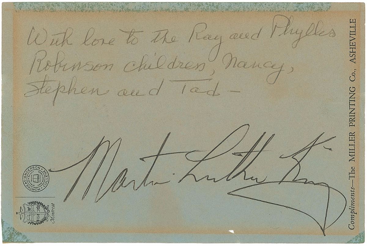 Large ballpoint signature, “Martin Luther King,” on a light blue 6 x 4 Montreat–Anderson College stationery sheet bearing an inscription in another hand, “With love to the Ray and Phyllis Robinson children, Nancy, Stephen and Tad—.” A small tear to bottom edge, toned adhesive remnants to top edge and lower corners, and a uniform block of toning from previous display, otherwise fine condition. Measuring roughly five inches long, this is an impressive and crisp example.