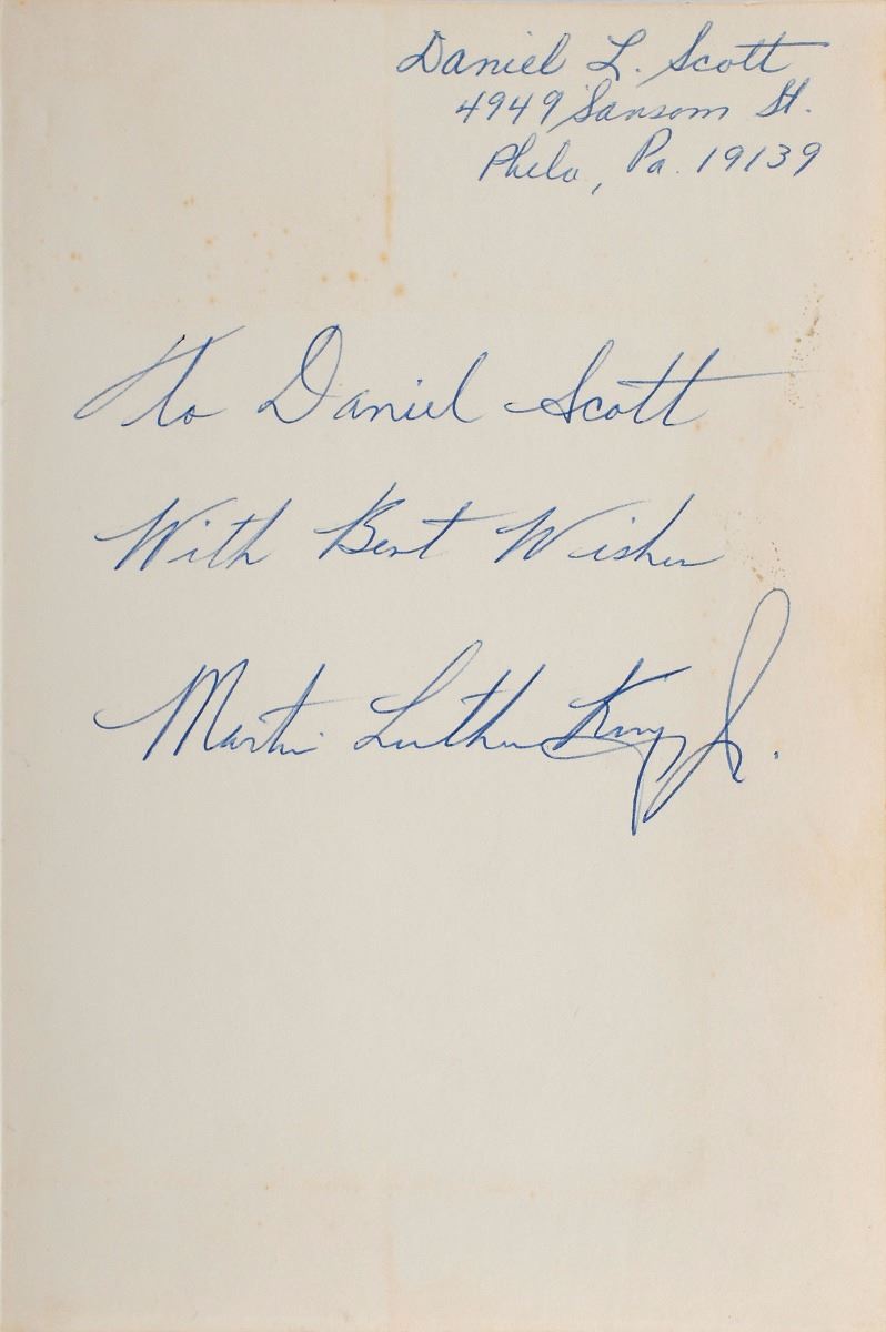 This book, which stemmed from King’s famous 1963 ‘Letter from Birmingham Jail,’ describes the nonviolent movement against racial segregation in the United States with a specific focus on the 1963 Birmingham campaign. The publication of the book afforded the ‘Letter from Birmingham Jail’ its widest circulation at the time and drew further support for the civil rights cause. King was awarded the Nobel Peace Prize for his nonviolent efforts against inequality at the end of 1964, just a few months after his appearance in Philadelphia. A superb inscribed example of King’s landmark text from a period of progress in the Civil Rights Movement.