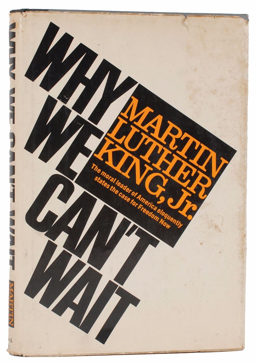 Signed book: Why We Can’t Wait. Later printing. NY: Harper & Row, 1964. Hardcover with dust jacket, 6 x 8.5, 178 pages. Signed and inscribed on the first free end page in blue ballpoint, “To Daniel Scott, With Best Wishes, Martin Luther King, Jr.” The recipient’s name and address is penned in the upper right in another hand. Autographic condition: very good to fine, with slight foxing to signed page. Book condition: VG/VG-. Accompanied by an unsigned program for a meeting held by the Alpha Kappa Alpha Sorority, Inc., in Philadelphia on August 10, 1964, where King appeared as the featured speaker; this was presumably where the book was signed.