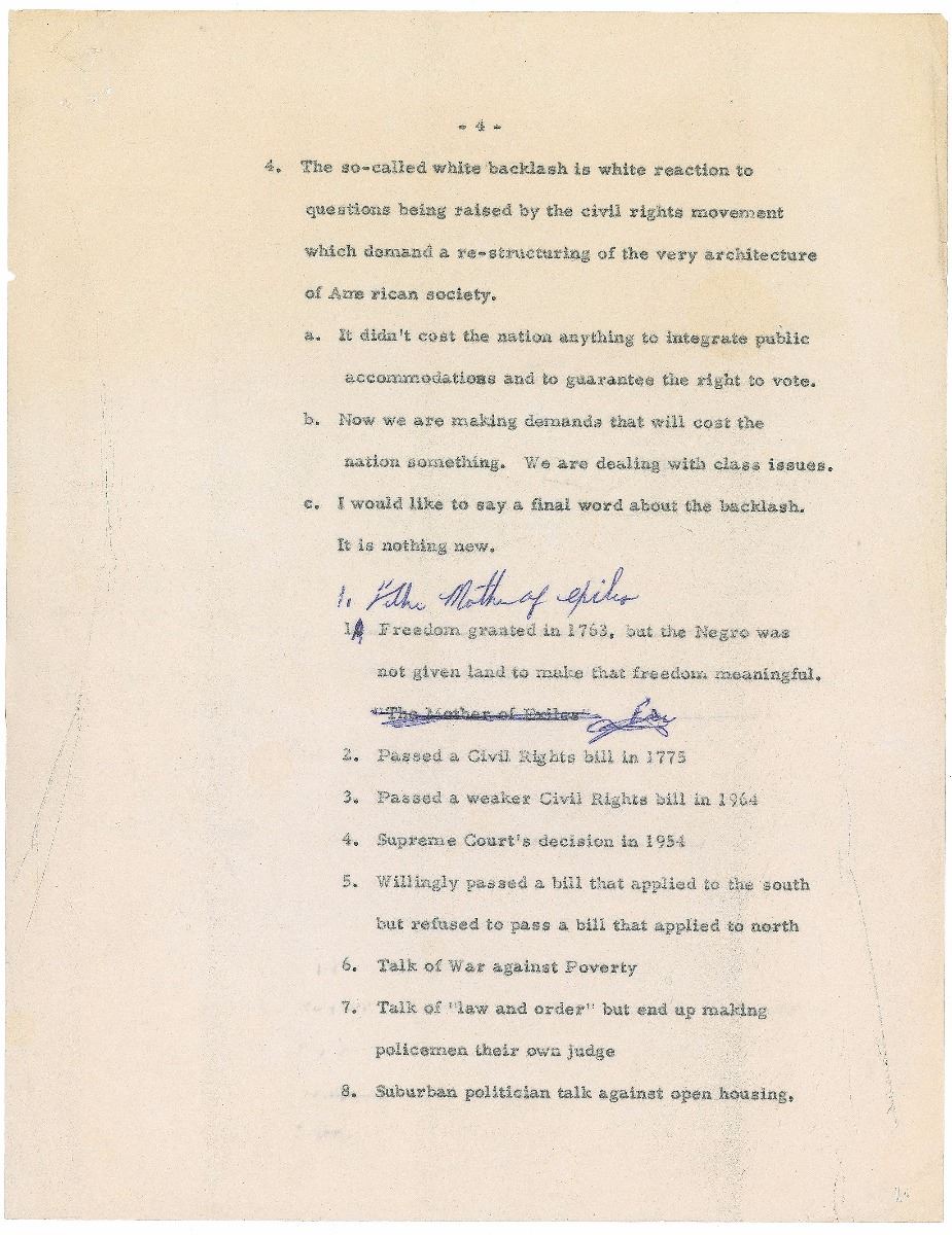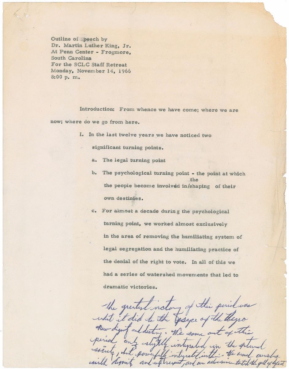 Draft typescript, unsigned, with extensive handwritten additions and edits. King’s outline for a speech delivered to the Southern Christian Leadership Conference’s staff retreat, Frogmore, South Carolina, November 14, 1966. 4 pages, 4to., edges chipped, small paper loss at one corner (not affecting text). King’s hand edits and additions in blue ink.