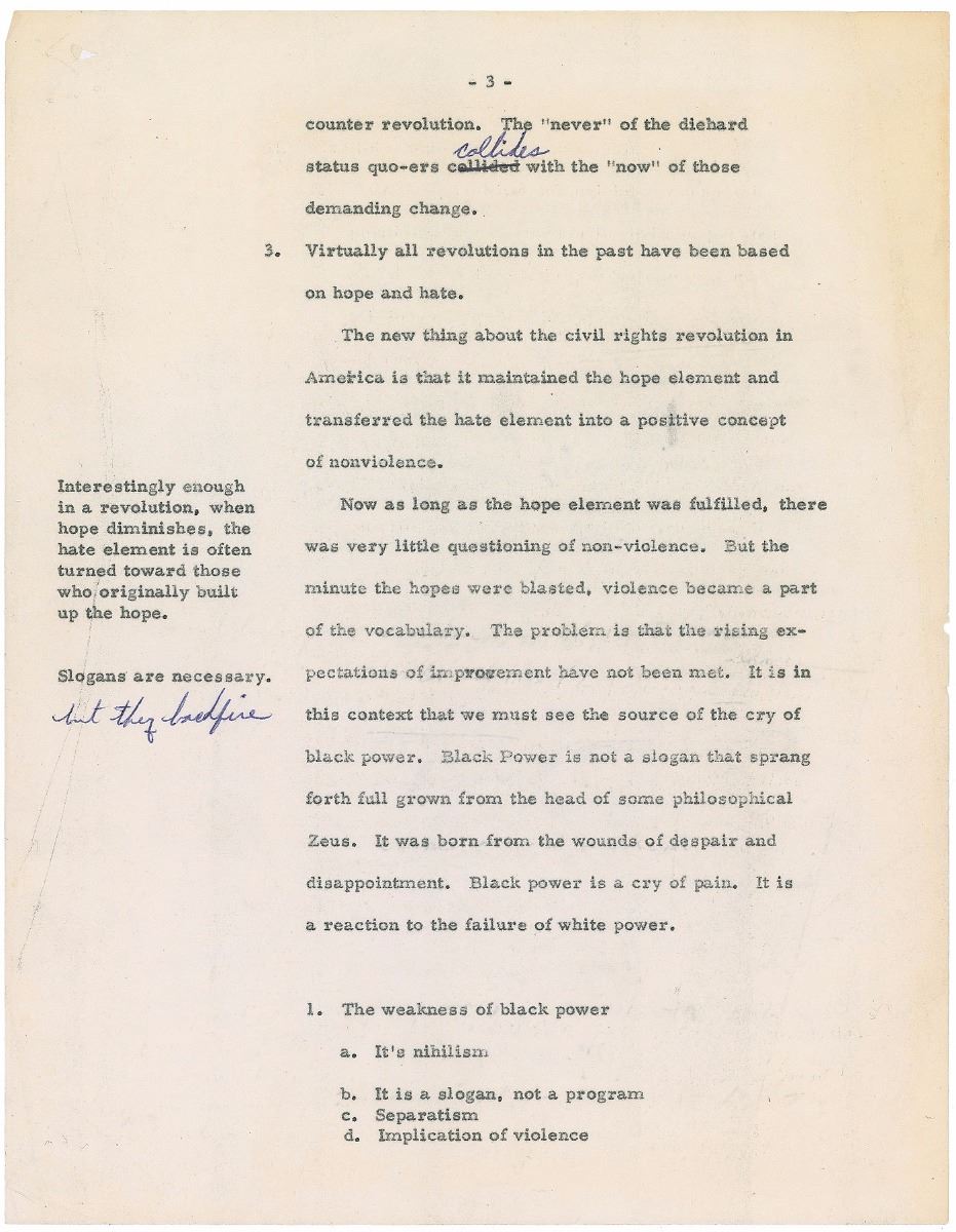 An exceptionally rare annotated King manuscript, with fascinating insights about the history of the Civil Rights campaign and King’s thoughts about the challenges from the Black Power movement (“It’s a slogan not a program'') and the growing white backlash (“It is nothing new'').