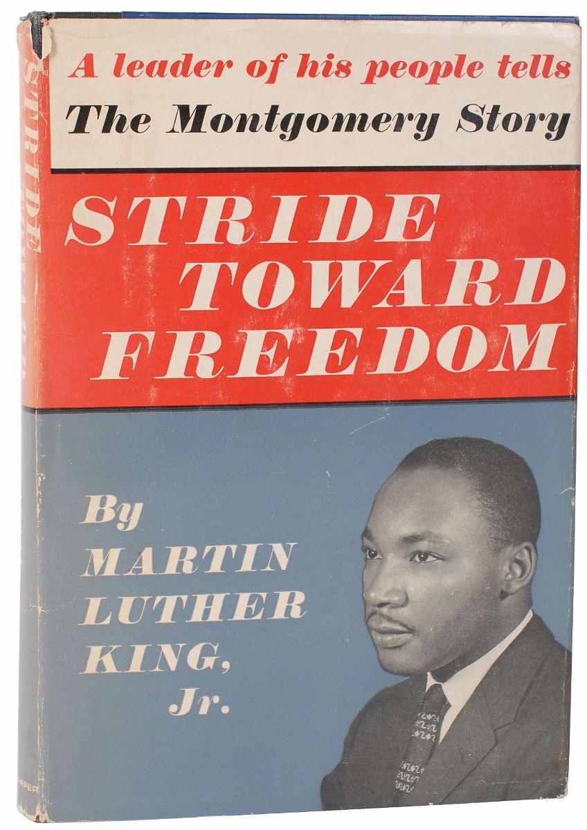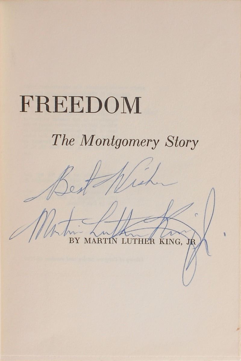 Signed book: Stride Toward Freedom. Later printing. NY: Harper & Brothers, 1958. Hardcover with dust jacket, 5.75 x 8.25, 230 pages. Nicely signed on the title page in blue ballpoint, “Best Wishes, Martin Luther King, Jr.” A previous owner’s notation on the half-title page indicates that he attended King’s funeral in Atlanta. Autographic condition: fine. Book condition: VG-/VG-. An attractive uninscribed copy of King’s first book.