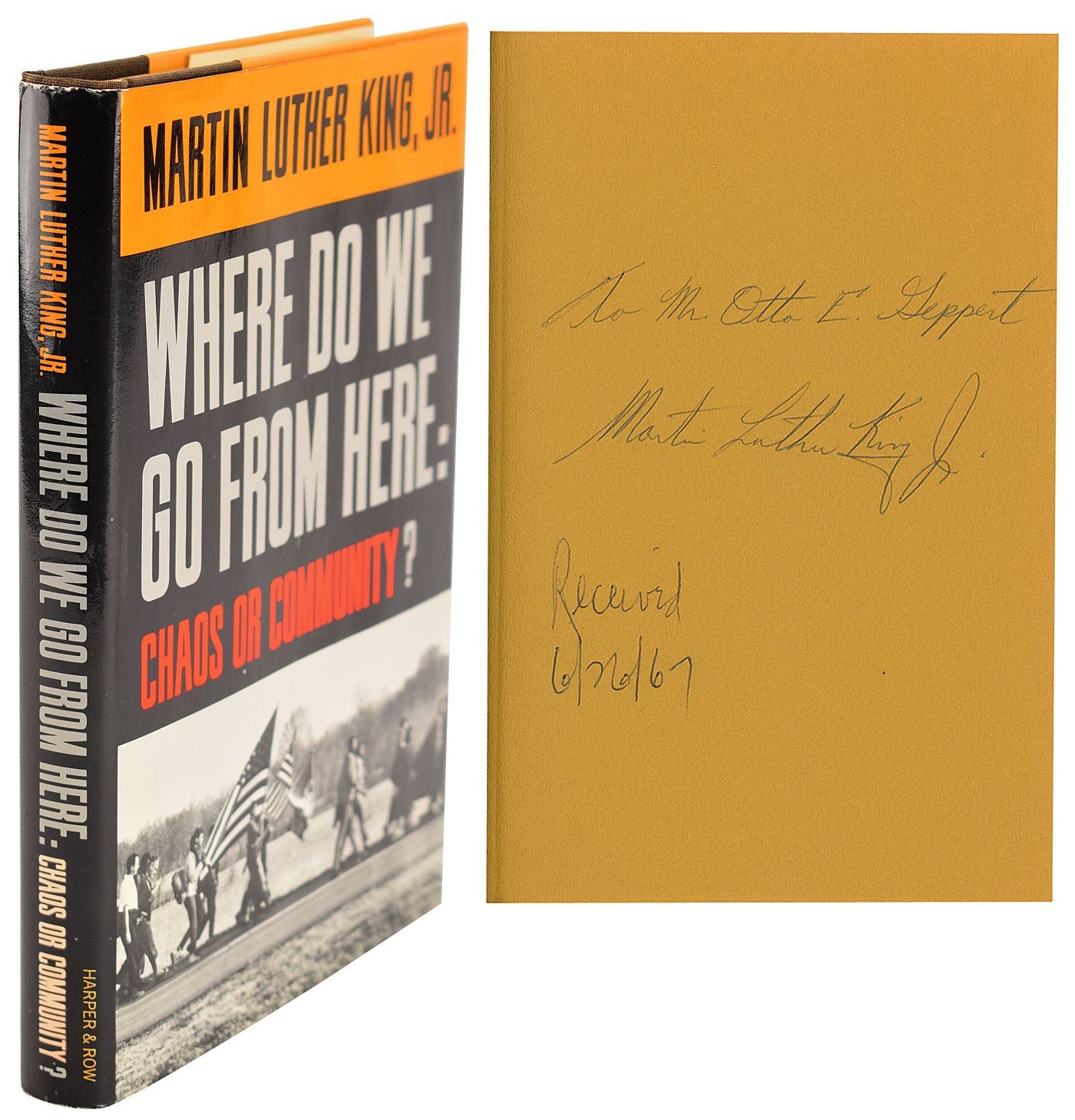 Signed book: Where Do We Go From Here: Chaos or Community? First edition. NY: Harper & Row, 1967. Hardcover with dust jacket, 6 x 8.5, 209 pages. Signed and inscribed on the first free end page in black ballpoint, "To Mr. Otto E. Geppert, Martin Luther King, Jr." Collector's notation to signed page dates the signature to June 16, 1967. Autographic condition: fine. Book condition: