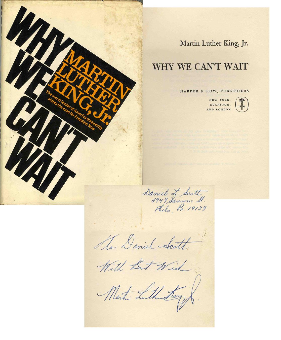 Martin Luther King, Jr. signed book ''Why We Can't Wait,'' written by King as a call to action for ''Freedom Now.'' Harper & Row: New York: 1964. Inscribed by King on the front free endpaper, ''To Daniel Scott / With Best Wishes / Martin Luther King, Jr.'' Present with dustjacket showing original $3.50 purchase price. Chipping and general wear to dustjacket as well as a 1'' v-shaped tear to rear cover. Book in excellent condition save for previous owner's writing ''D. Scott'' to tail edge and his name and address to ffep above King's inscription. Also included with lot is a program for an event on 10 August 1964 for Alpha Kappa Alpha Sorority in Philadelphia, where King was the featured speaker, and ostensibly where this book was signed. An important landmark book in the Civil Rights movement, made all the more moving with King's inscription.
