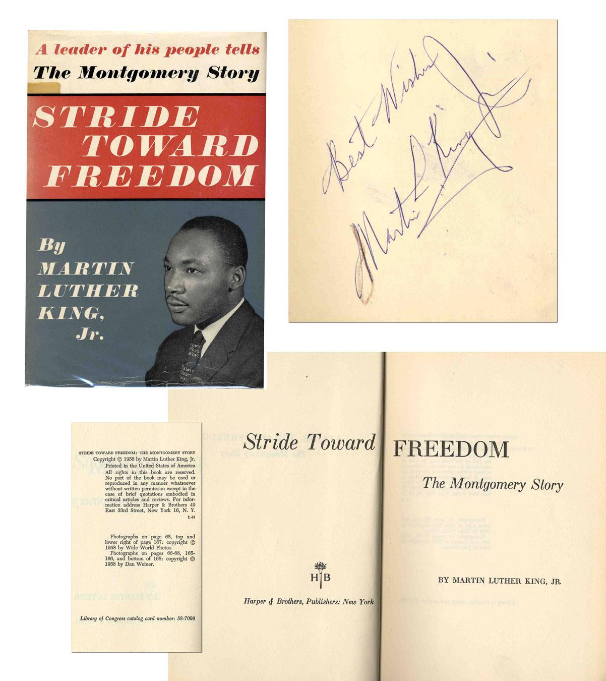 Martin Luther King, Jr's. signed copy of his first book ''Stride Toward Freedom: The Montgomery Story.'' New York: Harper and Brothers: 1958. First edition, fifth printing. Signed on the front free endpaper: ''Best Wishes Martin L. King, Jr.'' in blue ballpoint ink. King's account of the Montgomery bus strike quickly became a classic template for nonviolent resistance. In this rare book, King cites the philosophies of Gandhi as his major inspiration: ''…Prior to reading Gandhi, I had about concluded that the ethics of Jesus were only effective in individual relationships. The 'turn the other cheek' philosophy and 'love your enemies' philosophy were only valid, I felt, when individuals were in conflict with other individuals. When racial groups and nations were in conflict a more realistic approach seemed necessary. But after reading Gandhi, I saw how utterly mistaken I was…'' Book measures 5.5'' x 8.5'' and runs 230pp. Turquoise and black-striped boards with silver lettering. Previous owner's signature in pencil on front free endpaper and a child's drawings in crayon on the rear pastedown and rear free endpaper. Likely the same little troublemaker has traced over the ''M'' in ''Martin'' with a crayon, which fortunately is not readily visible. Book is overall in good condition with three pages having about one-third of text torn off. Some wear to board edges and corners. Original dustjacket with price intact, has one large chip at bottom of spine and sunning to spine, else very good condition.