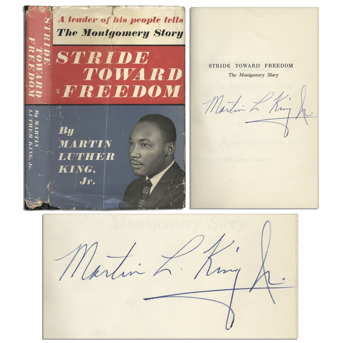 Scarce signed first edition of ''Stride Toward Freedom: The Montgomery Story'' by Martin Luther King, Jr., Harper & Brothers: New York: 1958. Boldly signed in blue ink ''Martin L. King, Jr.'' on title page. Copyright page states second printing date code ''I-H''. This was Dr. King's first book, published when he was only 29 years old, three years after he led the 1955 Montgomery Bus Boycott. The book documents significant events of the burgeoning Civil Rights movement and is illustrated with a dozen black and white photographs, including one of Dr. King wearing a prison booking number around his neck. Runs 230pp. Bound in blue cloth boards and black cloth spine with silver lettering. Measures 5.75'' x 8.25''. Includes original unclipped dustjacket, which is worn with significant tattering. Overall, a well-preserved piece of history signed in very good condition.