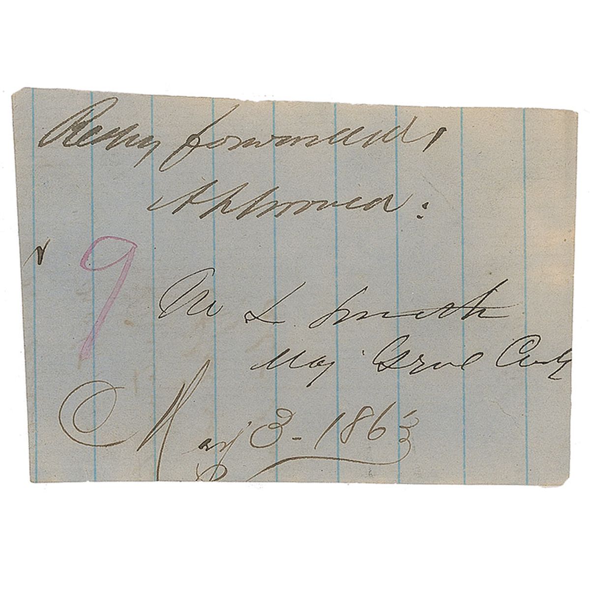 One of the select few Northern generals who fought on the side of the Confederacy, Smith strategized and implemented defenses at Vicksburg. War-dared ink signature, “M. L. Smith,” on a light blue 3 x 2 lightly-lined slip clipped from a larger endorsement, dated May 3, 1863. In very good condition, with toning, and pencil and ink notations in another hand.
