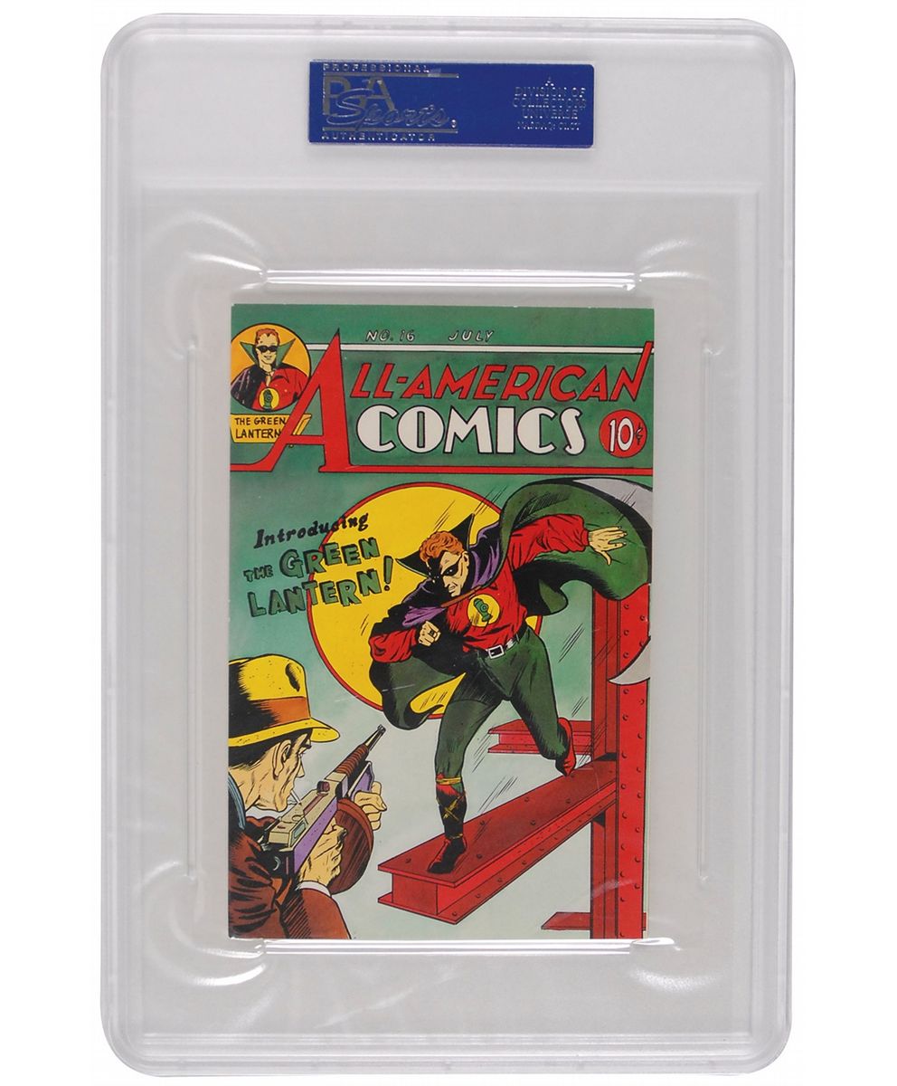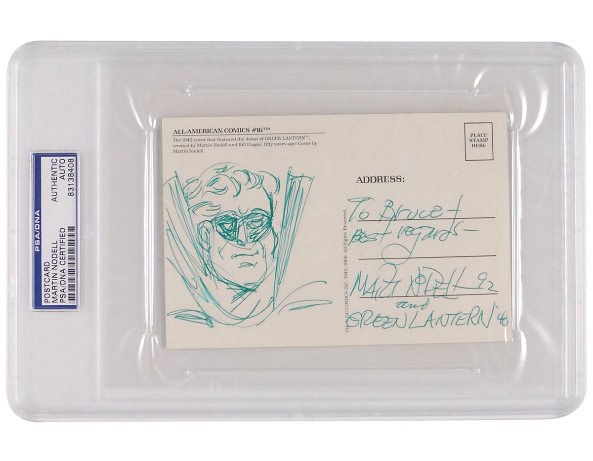 Green ballpoint sketch of the Green Lantern on the reverse of a 4.5 x 5.25 All-American Comics postcard, signed and inscribed in the address area, “To Bruce—Best regards—Martin Nodell 92 and Green Lantern 48.” Encapsulated in a plastic PSA/DNA authentication holder. In fine condition.