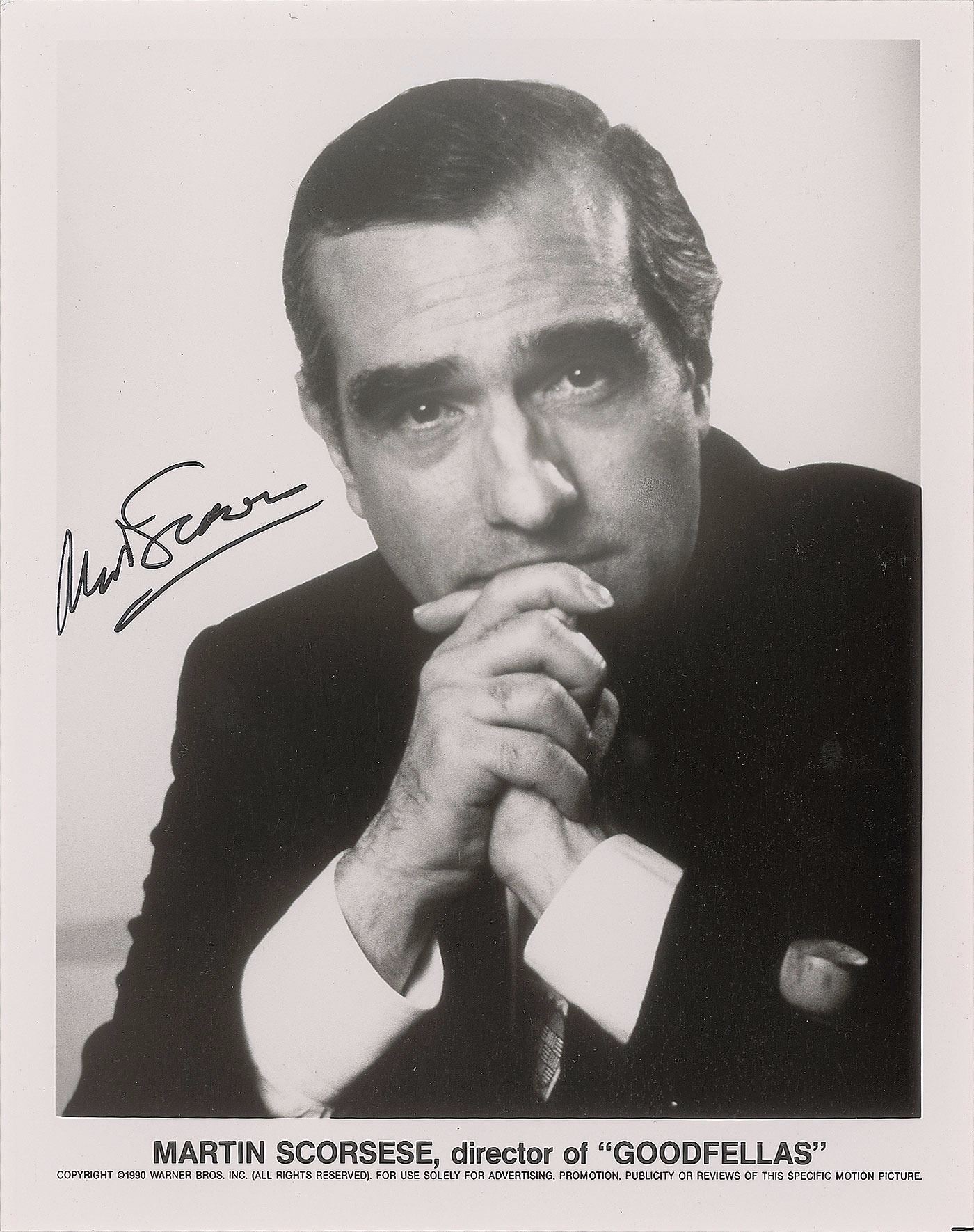 Ideal glossy 8 x 10 Warner Brothers publicity photo of the director of the 1990 film Goodfellas, signed in black felt tip by Scorsese. In very fine condition. From the Harvey and Rhoda Kuflik Collection.