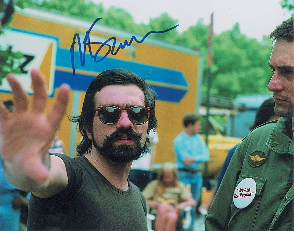 Color satin-finish 10 x 8 photo of Scorcese talking to Robert DeNiro on the set of Taxi Driver, signed in blue felt tip. In very fine condition.