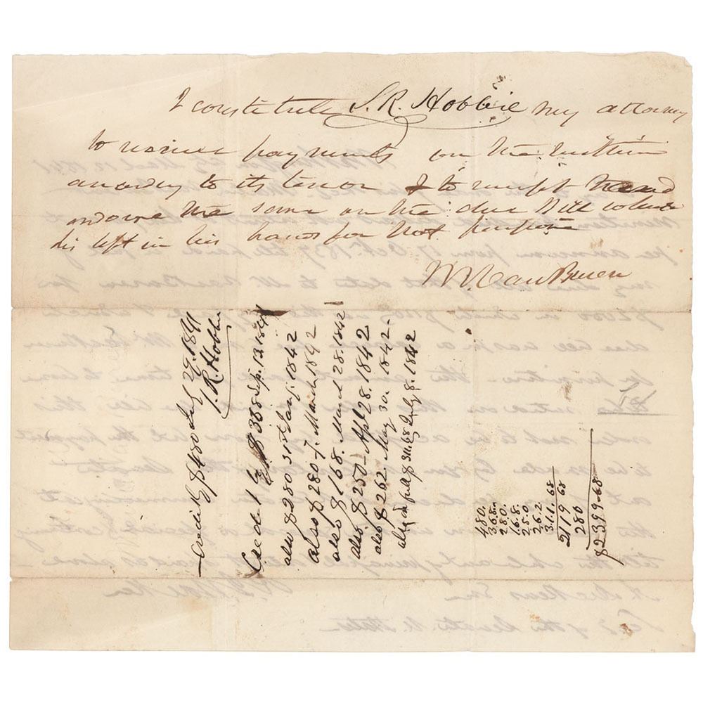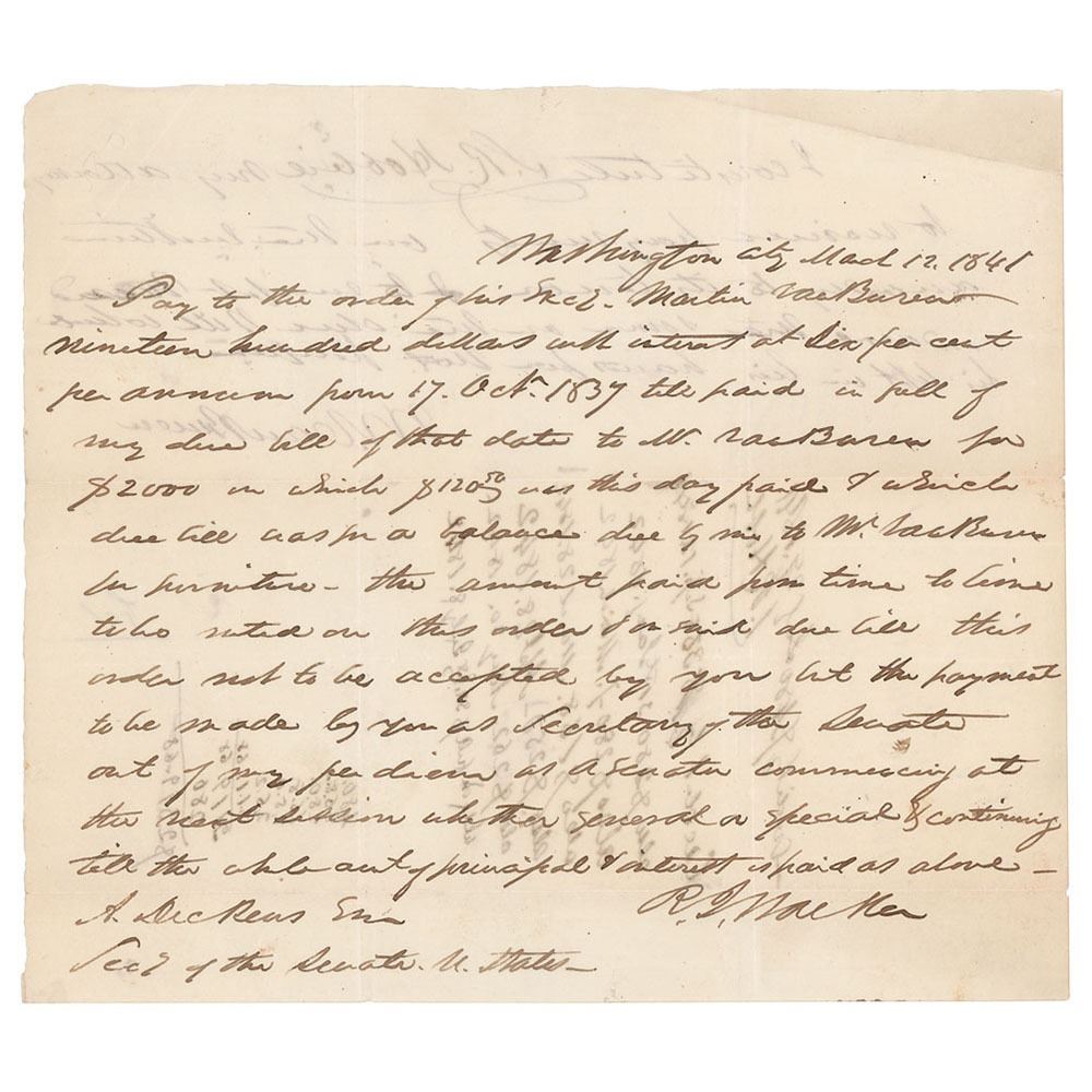 Autograph endorsement signed “M. Van Buren,†on the reverse of a manuscript document, one page, 8 x 7, March 12, 1841. Van Buren writes, in part: “I constitute…my attorney to receive payments…according to its tenor…and owe the same on the due Bill…left in his hands for that purpose.†The document on the opposite side, signed by Senator Robert J. Walker, in part: “Pay to the order of his Excy. Martin Van Buren nineteen hundred dollars with interest…for a balance due by me to Mr. Van Buren for furniture…the payment to be made by you as Secretary of the Senate out of my per diem as a Senator.†In fine condition, with a small split along one of the intersecting folds. Van Buren had left the White House just a week before the March 12th date of this document.