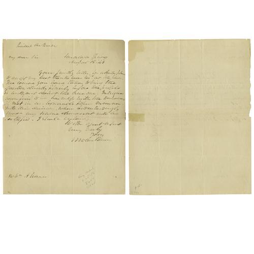 <B>Martin Van Buren Autograph Letter Signed, with Political Philosophy Content.</B></I> Written at "<I>Saratoga Springs, August 15, '43.</B></I>" Beige letter paper, measuring 7.5" x 9.75". Very fine save for trivial chips along left edge. <BR><BR>"<I>Saratoga Springs August 15, 1843 My dear Sir Your friendly letter, for which please to accept my best thanks was recd. At this place. The course you have taken to bring the question directly and fairly before the people is without doubt the true one. Intrigues never fail to be harmless with the Democracy if met in an honorable and open manner. With their decision, when understandingly made ever sincere democrat will be satisfied -- I shall certainly. With great respect Very truly Yours M. Van Buren.</B></I>" Provenance: King Hostick, 1956. From the Henry E. Luhrs Collection. Accompanied by LOA from PSA/DNA.