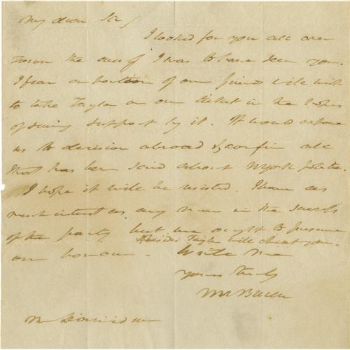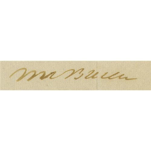 <B>Martin Van Buren Political Autograph Letter Signed</B></I>: "The Little Magician" exhibits his political adroitness in this letter to a fellow Bucktail, opposing support of a powerful Clintonian who, he adds, "<I>will cheat you.</B></I>"<BR><BR>Signed: "<I>M V Buren</B></I>", one page, 8" x 8". No place, no date. To Mr. Davidson. In full: "<I>My dear Sir, I looked for you all over Town the evening I was to have seen you. I fear a portion of our friends will wish to take Taylor on our ticket in the hopes of securing support by it. It would expose us to derision abroad & confirm all that has been said about NYork politics. I hope it will be resisted. I have as much interest as any man in the success of the party, but we ought to preserve our honour. Besides, Taylor will cheat you. Write me. Yours truly.</B></I>"<BR><BR>Although this letter is not dated, it most probably was written in 1820 about Congressman John W. Taylor. After Martin Van Buren won reelection to the State Senate in 1816 at the age of 32, he was named New York's Attorney General. Fellow Democratic-Republican De Witt Clinton had served as U.S. Senator, Mayor of New York City, State Senator, and Lieutenant Governor of New York, and was the Federalist candidate for President in 1812. From his position as Attorney General, Van Buren and his supporters struggled unsuccessfully to replace DeWitt Clinton as party leader. Van Buren's followers, known as Bucktails because they wore buck tails on their hats when they attended political meetings, held numerous state offices. When Clinton became Governor of New York in 1817, succeeding Bucktail Daniel Tompkins, he began to dismiss all Bucktail appointees in the state government. Van Buren retained his post of Attorney General until 1819, then lost it to the Clinton forces.<BR><BR><B>Daniel D. Tompkins</B></I> (1774-1825), had preceded Clinton as Governor of New York, serving from 1807-1817 when he was sworn in as Monroe's Vice President. In 1820, even though he was the Vice President, the Bucktails nominated Tompkins to run for Governor against Clinton, hoping their wing of the Democratic-Republican Party would regain control of state politics and patronage. Tompkins lost the race for Governor but was reelected Vice President.<BR><BR><B>John W. Taylor</B></I> (1784-1854) had served in the House of Representatives since 1813 and was the senior member of the New York delegation, an influential member of Congress, and a Clintonian.<BR><BR>Van Buren had formed a formidable political organization while in Albany as State Senator and Attorney General. Through what has been said to be devious schemes, he was able to force the removal of key Clinton political appointees. His political skills and his height (5' 6") earned him the sobriquet "The Little Magician." By 1820, his enemies referred to his circle of politicians, New York's first political machine, as the "Albany Regency." Through alliances, its power spread throughout the state. Van Buren alludes to this when he says that if Taylor is put on the Bucktail ticket, it would "<I>confirm all that has been said about NYork politics.</B></I>"<BR><BR>Henry Clay had resigned as Speaker of the House on October 28, 1820; he was unable to maintain his post because of financial problems. Taylor had support for Speaker but needed the votes of Bucktails in the New York congressional delegation to win, so he pledged to them his neutrality in New York politics. These may have been the "<I>friends…who wish to take Taylor on our ticket</B></I>" mentioned by Van Buren in this letter. On November 15, 1820, Taylor was elected Speaker by one vote after convincing five Bucktails who had voted for another candidate on the first day of balloting, to vote for him. Van Buren knew that Taylor was firmly in the Clinton camp and while he was interested in the success of his party, Van Buren felt that the Bucktails should resist the temptation and "<I>preserve our honour.</B></I>" On February 6, 1821, Martin Van Buren was elected U.S. Senator over Nathan Sanford, the Clintonian candidate. Even though he was now a U.S. Senator, he still controlled the Albany Regency. His immediate goal was to have Taylor replaced as Speaker.<BR><BR>Van Buren's feelings towards the Speaker is evident in this letter ("<I>Taylor will cheat you</B></I>"). Even before Van Buren took his seat in the Senate, he began to help orchestrate Taylor's ouster. Van Buren believed the post of Speaker of the House would be important in the presidential election of 1824 since candidates for President were nominated by congressional caucuses. While it had its factions, there was, in effect, one political party in America, the Democratic-Republicans. In the election of 1820, President James Monroe won all 24 states and Van Buren was looking forward to 1824. The Little Magician worked his magic. When the new Congress convened, Virginia Congressman Philip P. Barbour was elected Speaker of the House on the 12th ballot, defeating Taylor 88-67, increasing Van Buren's influence in Washington. In 1824, Van Buren managed the congressional caucus that nominated Secretary of the Treasury William H. Crawford of Georgia for President. After John Quincy Adams was elected President, Van Buren became a Jacksonian. Governor De Witt Clinton died in 1828 and Van Buren was elected Governor of New York and took office on January 1, 1829. Two months later, President Jackson appointed him Secretary of State, then U.S. Minister to England. In 1832, Van Buren was elected Jackson's Vice President and, in 1836, President of the United States.<BR><BR>This excellent political letter, with a small nick at the left edge, is in very fine condition. Displaying Van Buren's acumen and acuteness in getting his point across, it was penned at a critical time in Van Buren's political life. It would make a fine addition to any political or presidential collection. <I>From the Gary Grossman Collection.</B></I><BR><BR><b>Shipping:</b> Fla