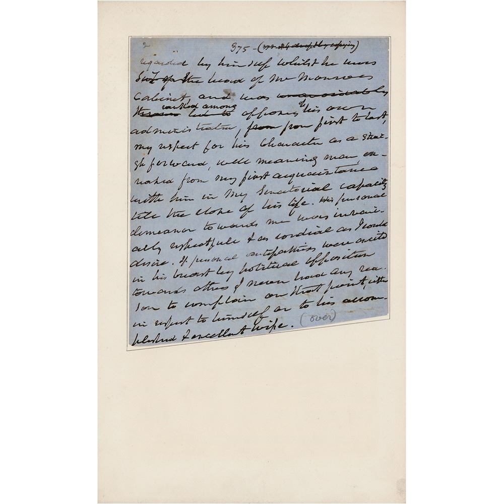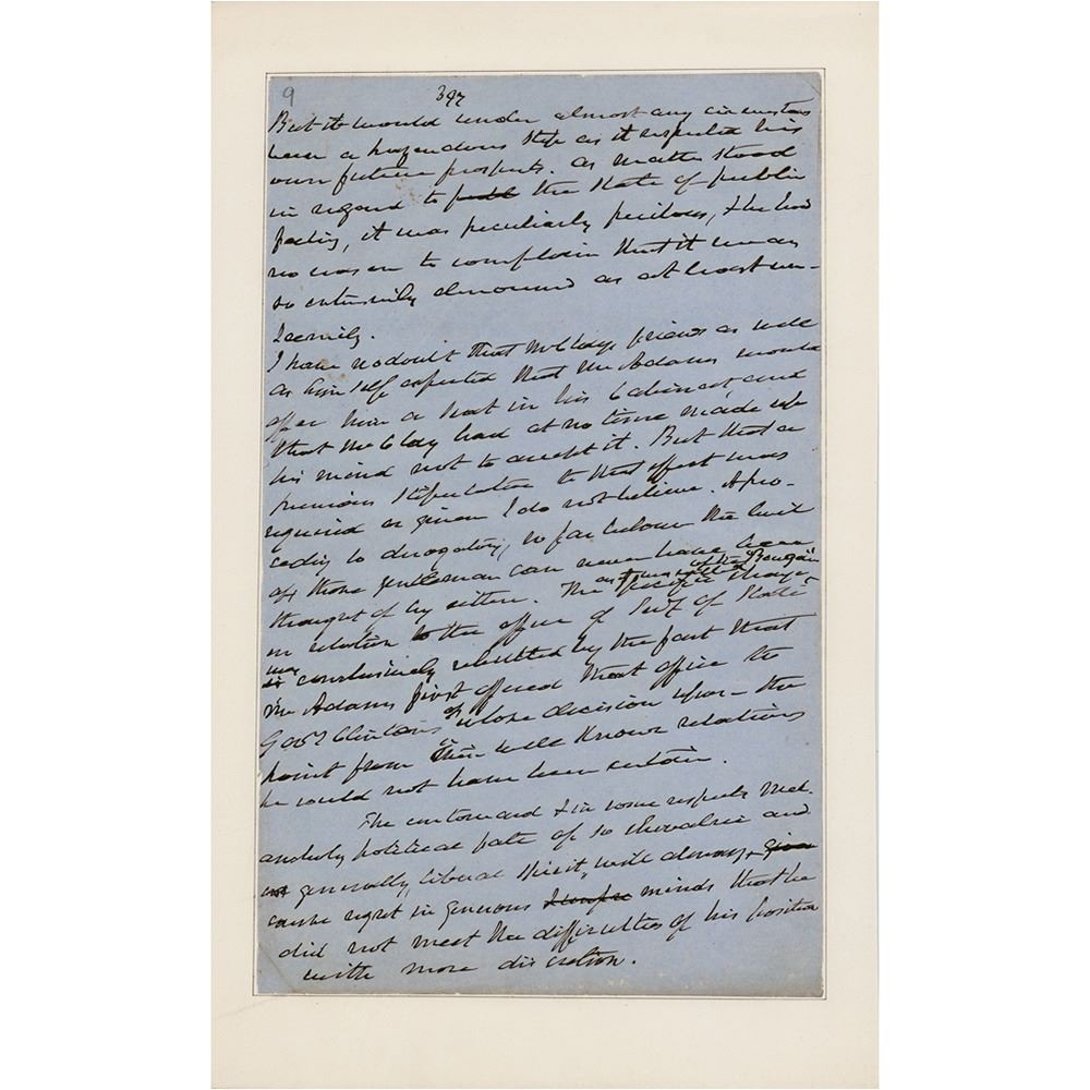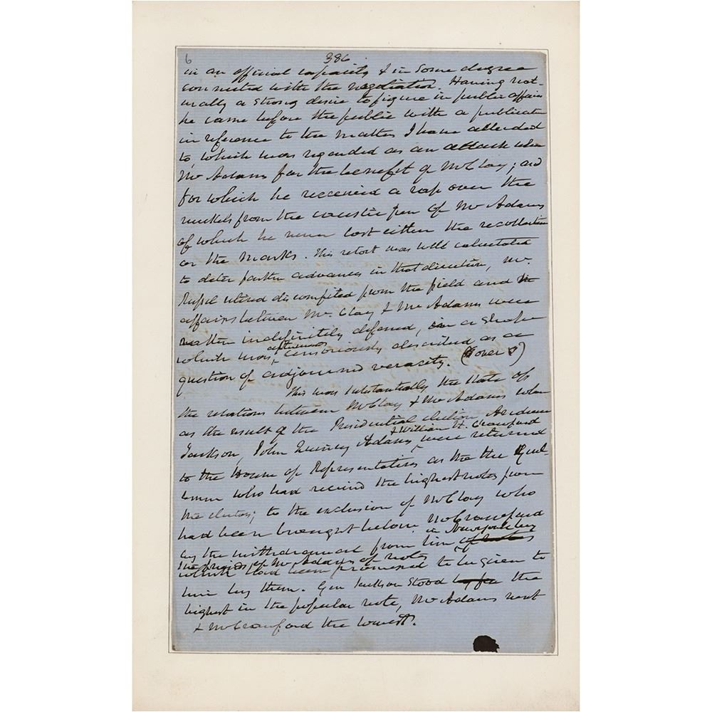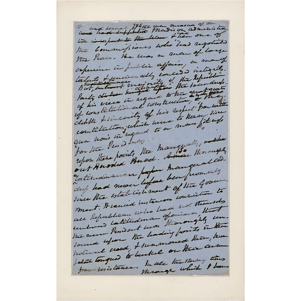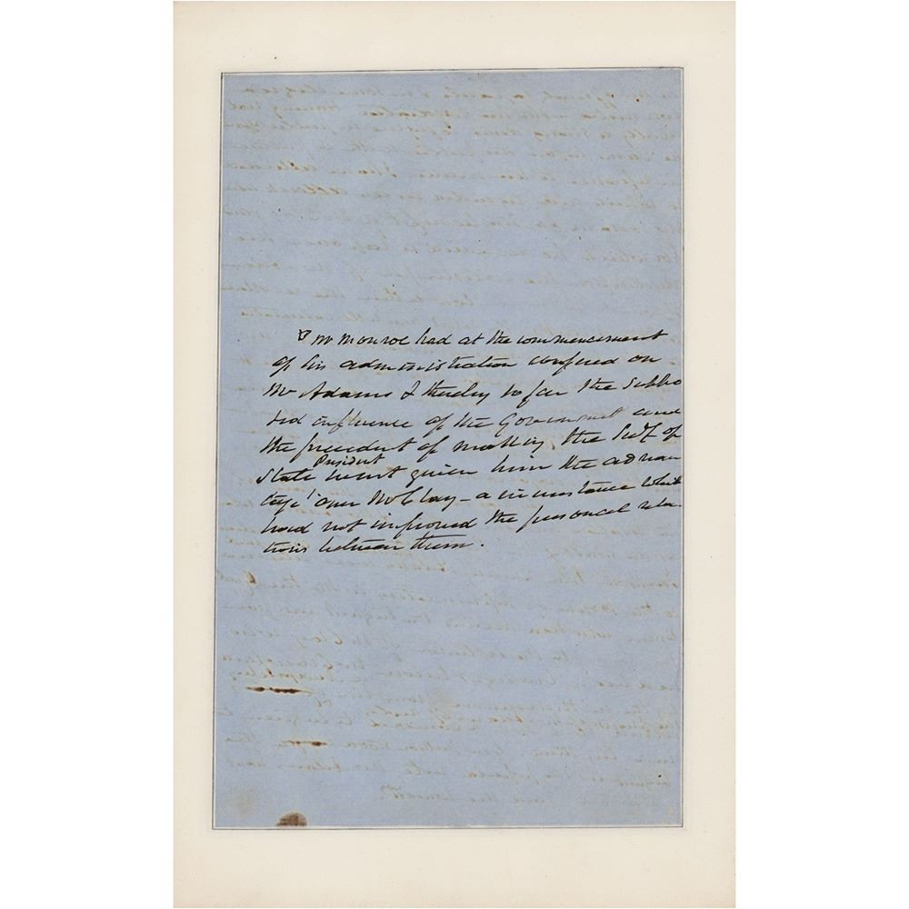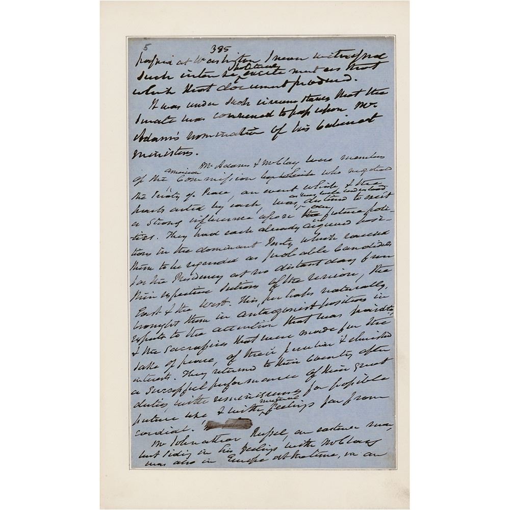 Handwritten draft of a biographical sketch of John Quincy Adams by Martin Van Buren, totaling 14 pages on 11 sheets, mostly 7.75 x 12.75 and inlaid into larger sheets, no date but circa 1854. Van Buren prepared this as part of his autobiography, which he began writing at Villa Falangola in Sorrento, Italy, on June 21, 1854. The manuscript would not be completed until after his death, when it was left in the care of his son and literary executor Smith Thompson Van Buren. After making a manuscript copy from his father's autograph draft, Smith completed the manuscript and presented it to the Library of Congress in 1905. The majority of the original copy was either dispersed or discarded, but fragments of chapters such as these can still be found. The section of the manuscript offered here is a portrait of John Quincy Adams, who, although a former political rival of Van Buren's, still appears to have commanded a great deal of respect from his successor.