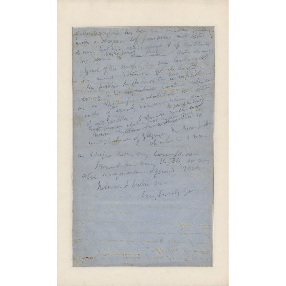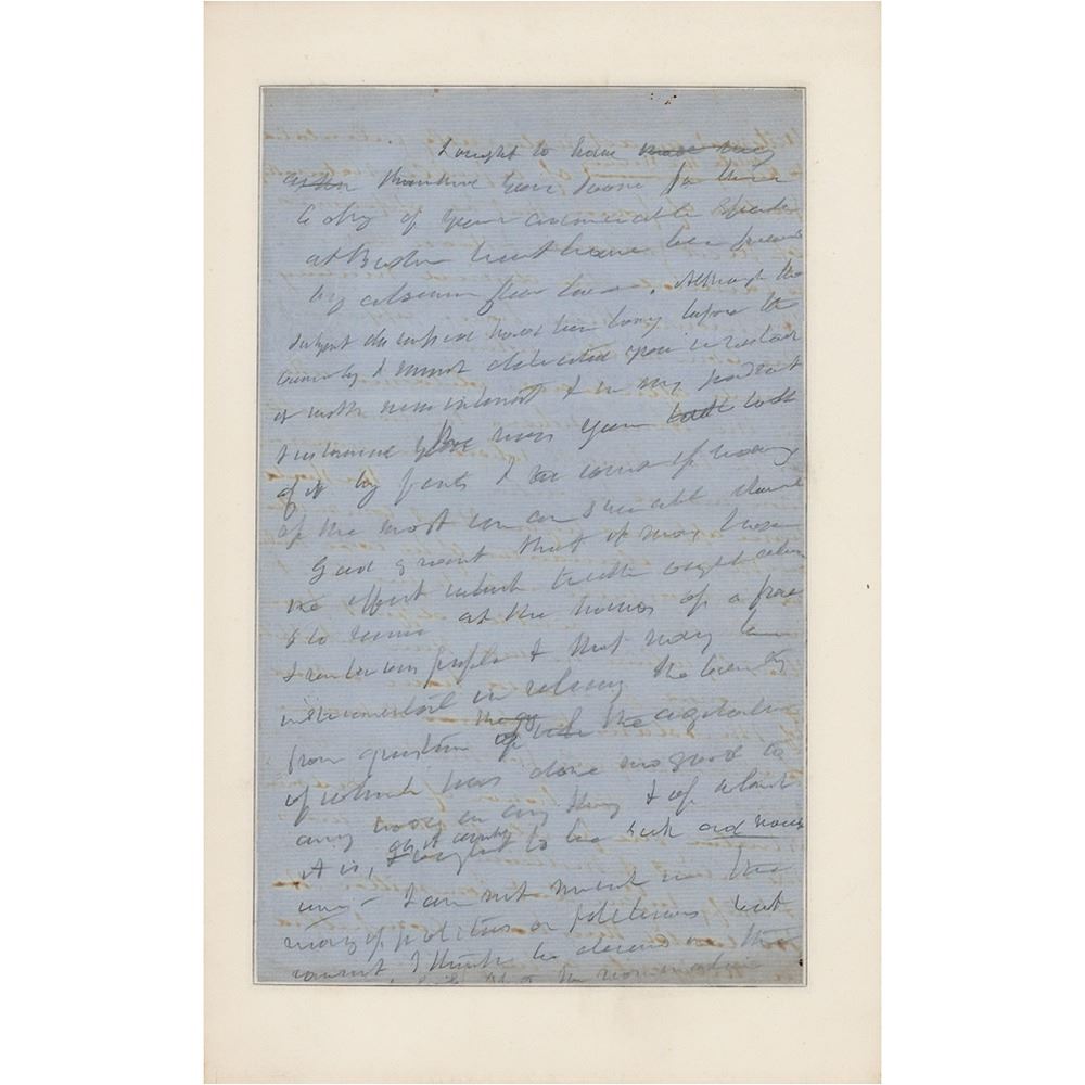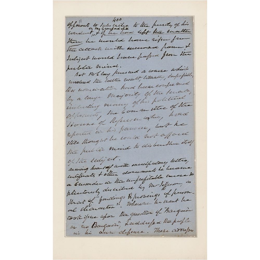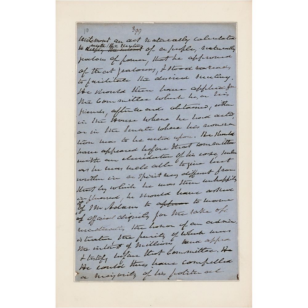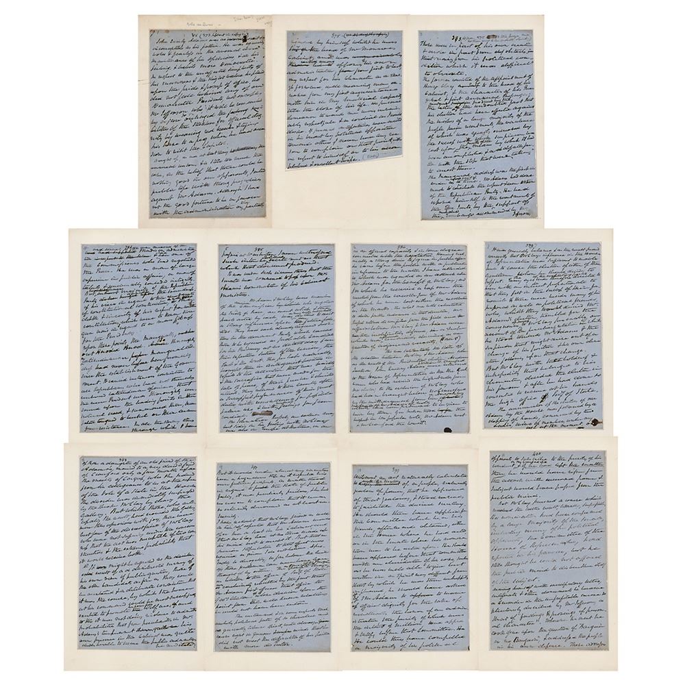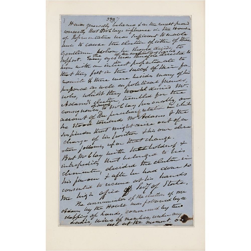 Handwritten draft of a biographical sketch of John Quincy Adams by Martin Van Buren, totaling 14 pages on 11 sheets, mostly 7.75 x 12.75 and inlaid into larger sheets, no date but circa 1854. Van Buren prepared this as part of his autobiography, which he began writing at Villa Falangola in Sorrento, Italy, on June 21, 1854. The manuscript would not be completed until after his death, when it was left in the care of his son and literary executor Smith Thompson Van Buren. After making a manuscript copy from his father's autograph draft, Smith completed the manuscript and presented it to the Library of Congress in 1905. The majority of the original copy was either dispersed or discarded, but fragments of chapters such as these can still be found. The section of the manuscript offered here is a portrait of John Quincy Adams, who, although a former political rival of Van Buren's, still appears to have commanded a great deal of respect from his successor.