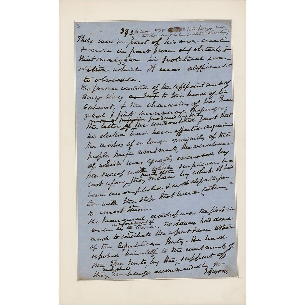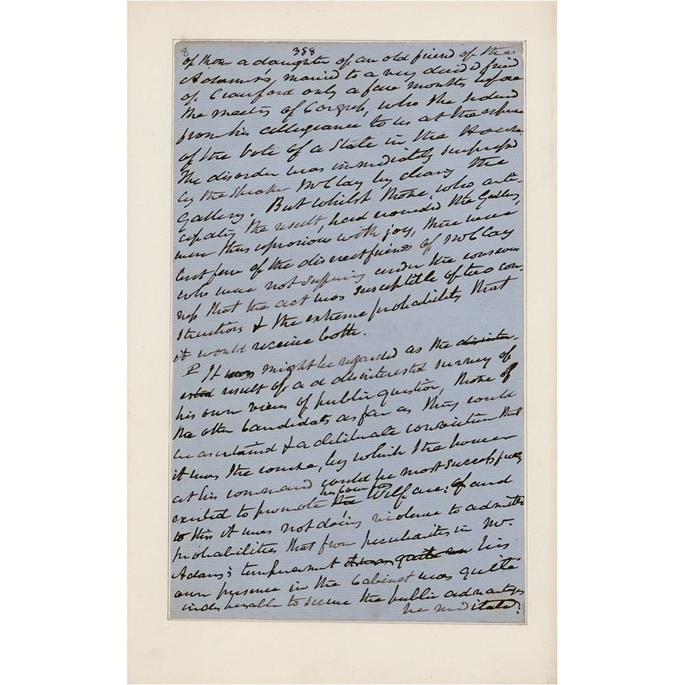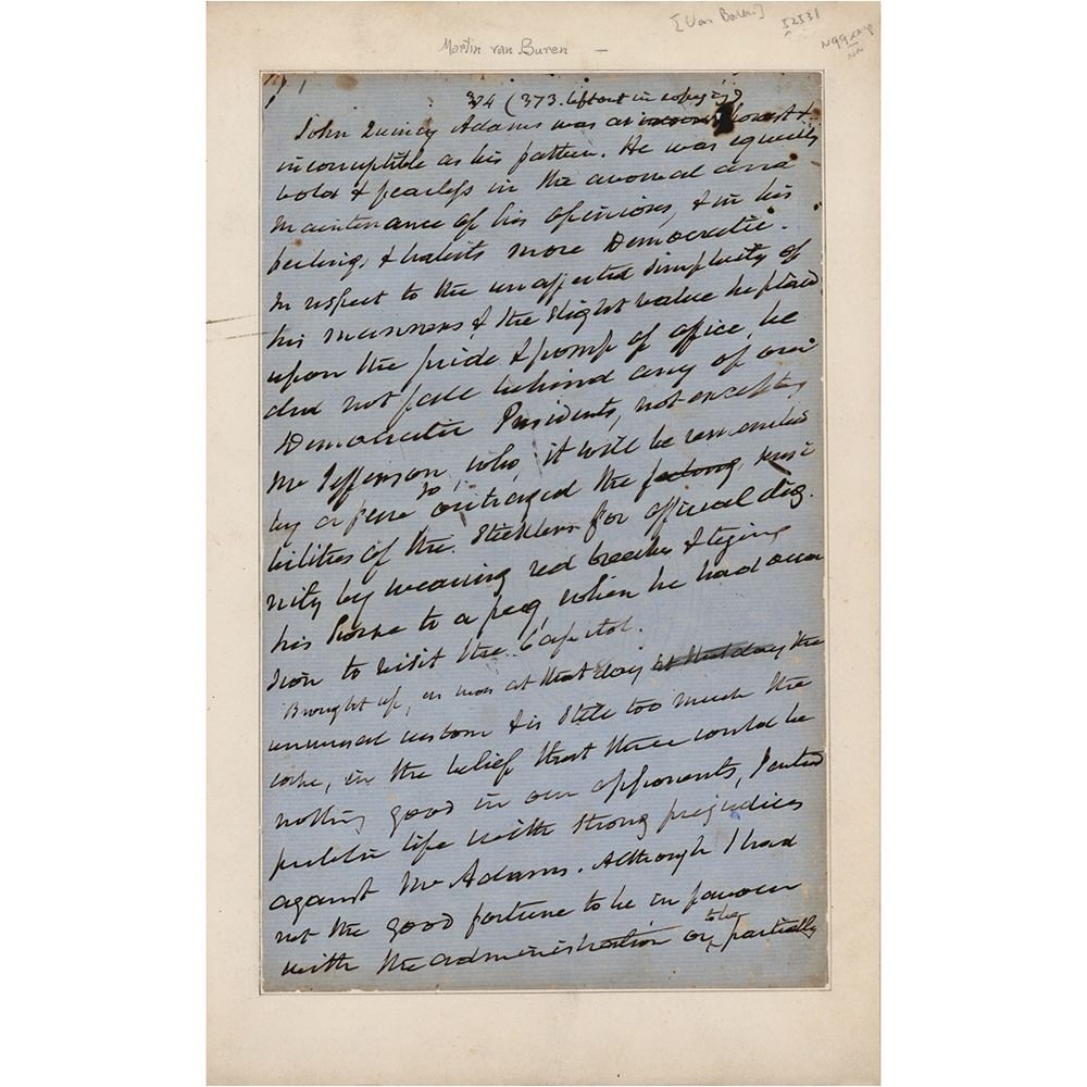 These were in part of his own creation & arose in part from obstacles rising from his political condition which it was difficult to deviate. The former consisted of the appointment of Henry Clay to the head of his Cabinet, & the character of his Inaugural & first annual messages; The latter resentments produced by the undoubted fact that his election had been effected against the wishes of a large majority of the people, resentments the virulence of which was greatly increased by the success with which suspicion was cast upon the purity of the means by which it had been accomplished & a dissatisfaction with the steps that were taken to avert them. The Inaugural address was the first in order in point of time. Mr. Adams had done much to conciliate the respect & new esteem of the Republican Party. He had assured Himself to the resentments of the Essex Junto by the support of theEmbargo recommended by Mr. Jefferson, and several of the war measures of Mr. Madison's administration." The pages have been paginated by Van Buren 374-375, 383-388, 397, 399-400, with numerous deletions and emendations. In fine condition. Accompanied by a custom-made presentation folder with gilt-stamped title. A superb and historic manuscript as one president evaluates the life and legacy of another.