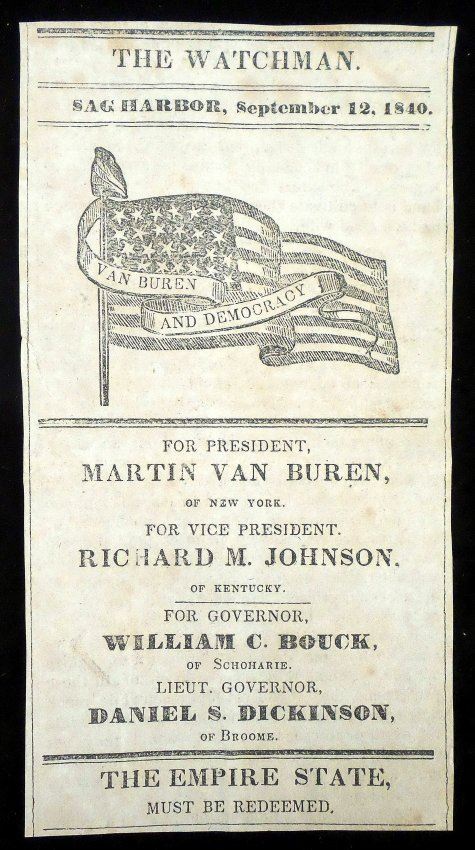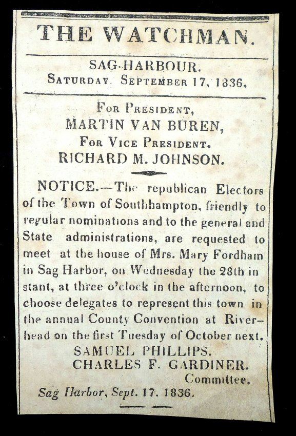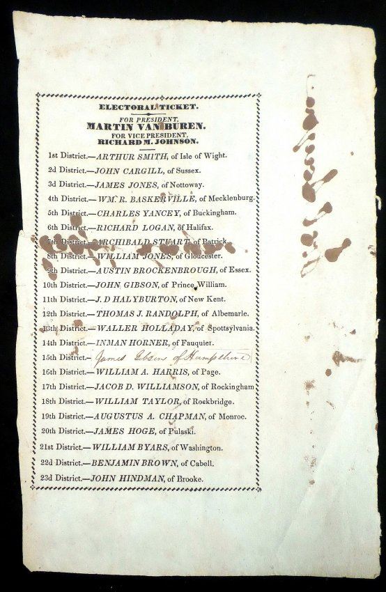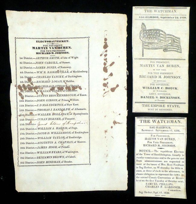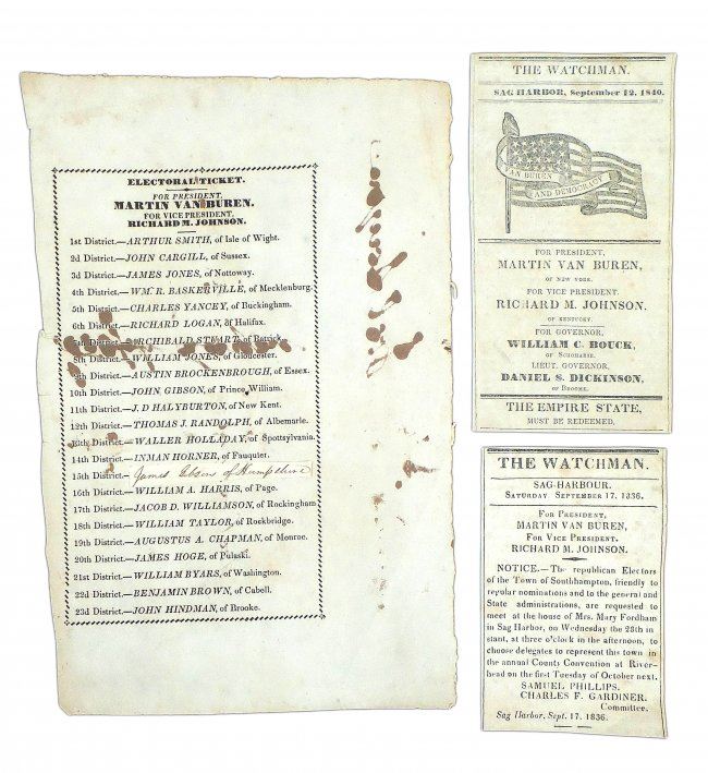 Printed Van Buren and Johnson electoral ballot 1836, 8vo, 1 page. Features signature of elector "Joel Sayne" three times on verso [9" H x 6" W]. Defects include: central spindle hole, light toning, creases, and verso ink show-through in wide right margin and on printed area affecting three lines of text. Bears a period glued-down strip with manuscript addendum for the representative from district 15 "James Gibson of Hampshire". Accompanied by two clipped, column width, Martin Van Buren newspaper campaign advertisements from "The Watchman," Sag Harbor, NY [one announcing a mandatory meeting at Mrs. Mary Fordham's house to choose delegates at the county convention, 1836].